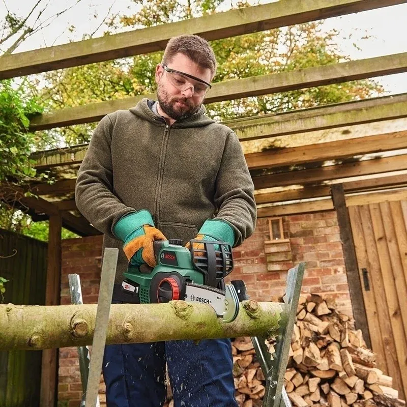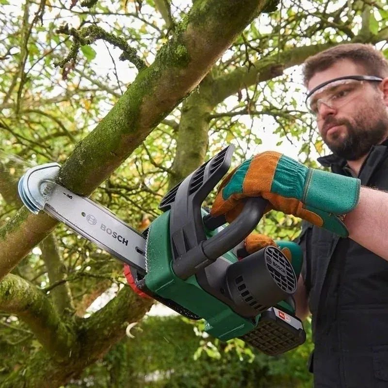 Цепная пила Bosch оснащена двигателем, который способен раскрутить цепь до 4,5 м/с, что подходит для садовых работ – кронирования деревьев, обрезки кустарников, резки дров и т.д.Инерционный тормоз срабатывает, если пила застревает в дереве или ее отбрасывает назад. В этом случае цепь останавливается за доли секунды, предотвращая травмы.