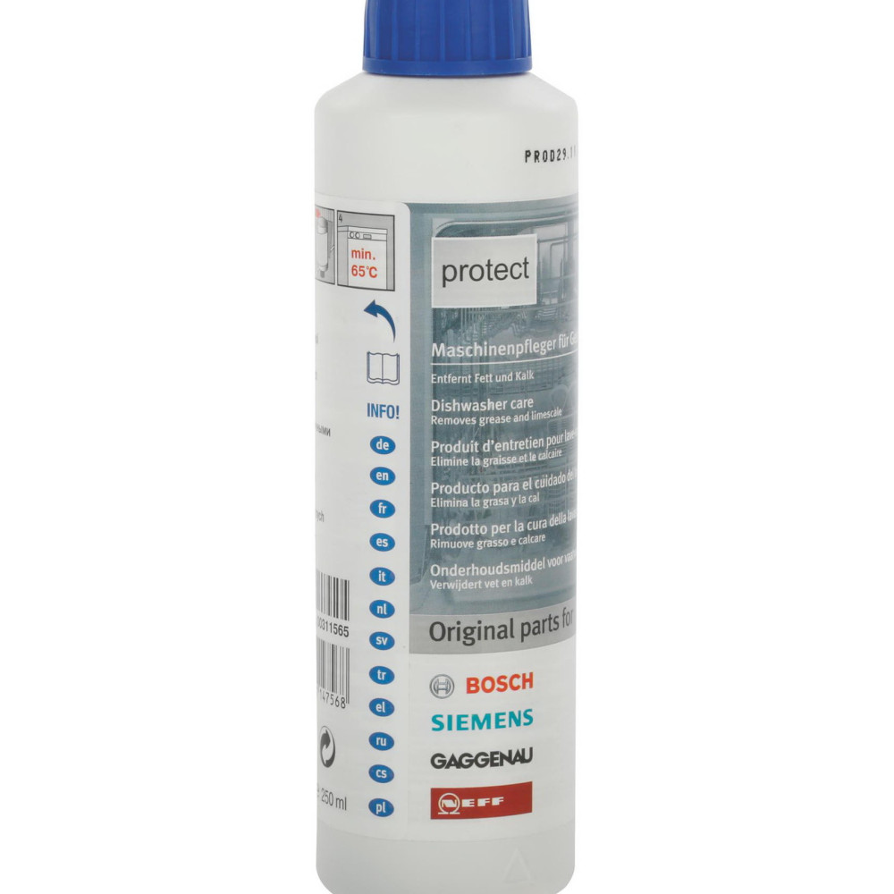 Объем средства в бутылке предназначен для одного цикла чистки. Нужно снять металлическую пленку с пробки, в машину без посуды установить бутылку «вверх ногами», и запустить программу интенсивной мойки. Рекомендуется использовать каждые 1-2 месяца.