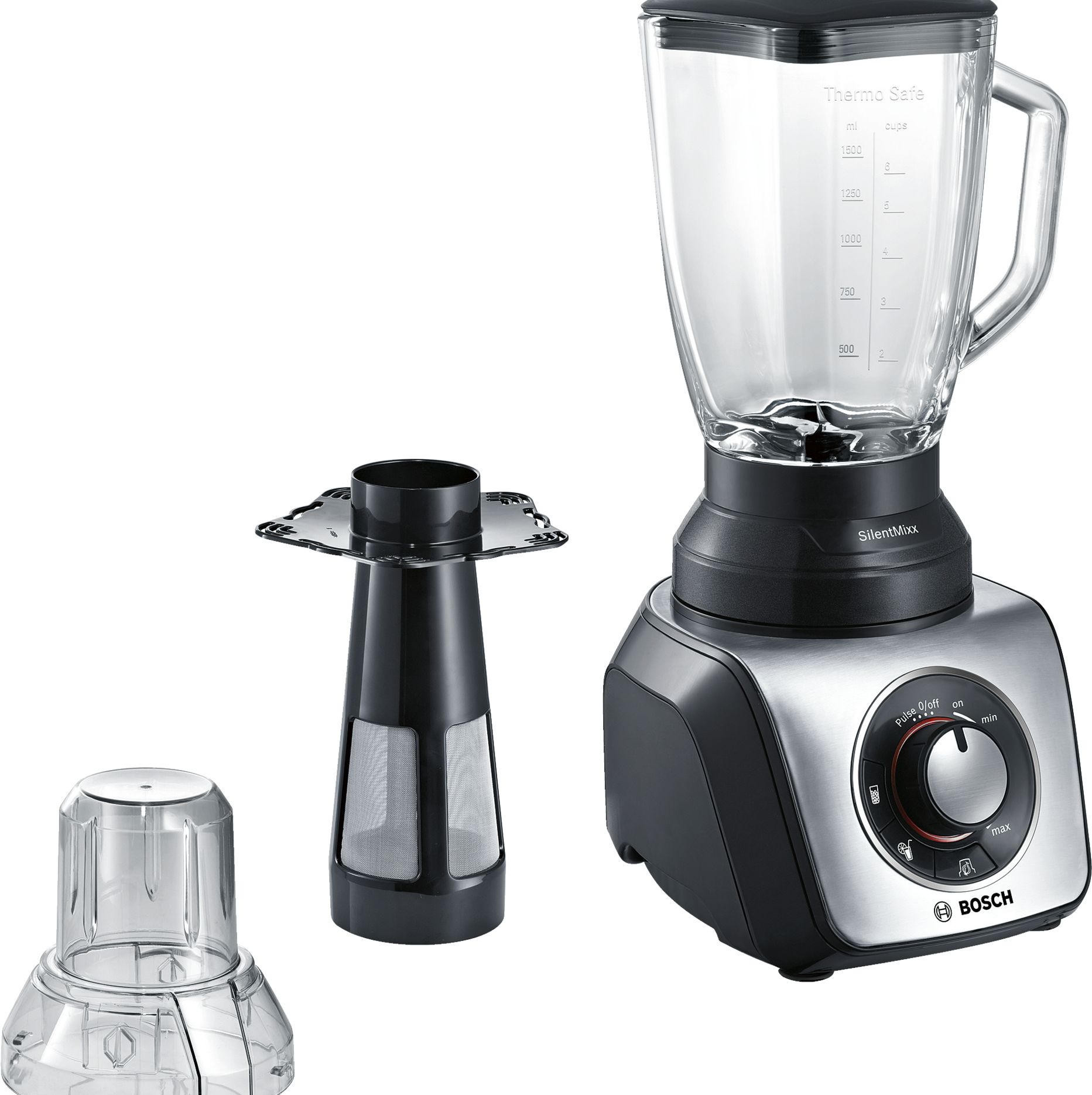 Блендер Bosch MMB64G3M подходит для приготовления горячих и холодных супов и напитков. Предусмотрены специальные режимы для кубиков льда и смузи. Измельчитель справляется с такими твердыми продуктами, как зелень, орехи, твердый сыр, шоколад, лук. Фильтр-сито поможет приготовить смузи без кожицы и семян и соевое молоко.