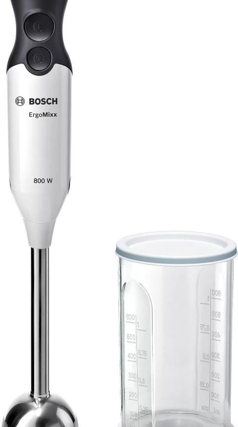 Блендер Bosch MS 61B6170 оснащен 12 скоростями измельчения для достижения наилучшего результата приготовления пюре, соусов, смузи и прочих блюд. В комплекте прилагается мерный стакан с крышкой для измерения объема и хранения напитков. Высокая мощность мотора в 800 Вт обеспечит качественный результат в короткие сроки, позволит переработать даже твердые продукты. Погружную насадку можно снять одним нажатием кнопки и мыть в посудомоечной машине.
