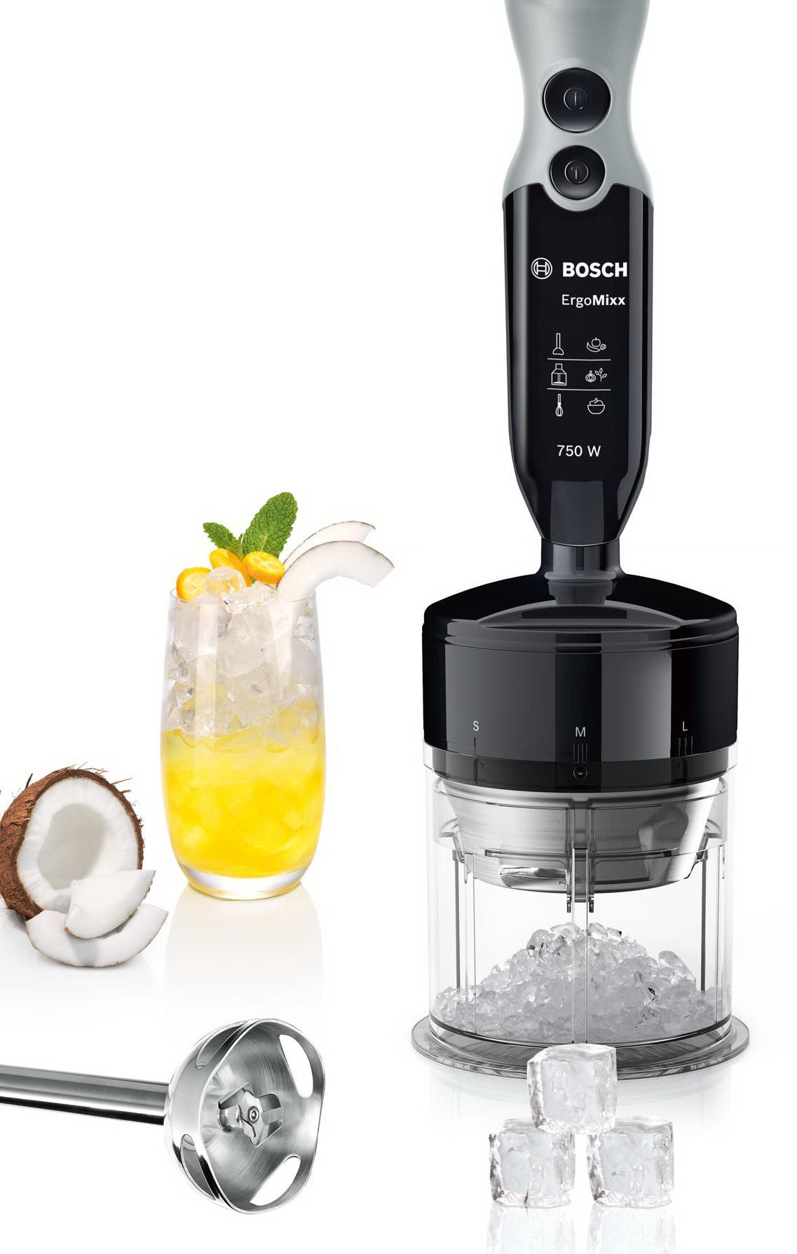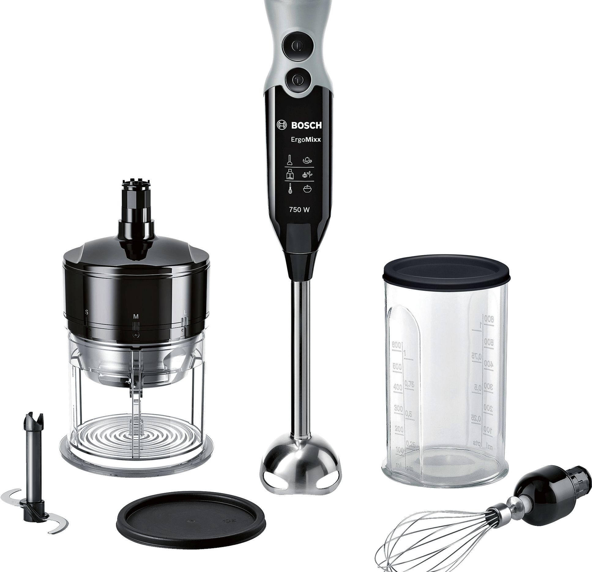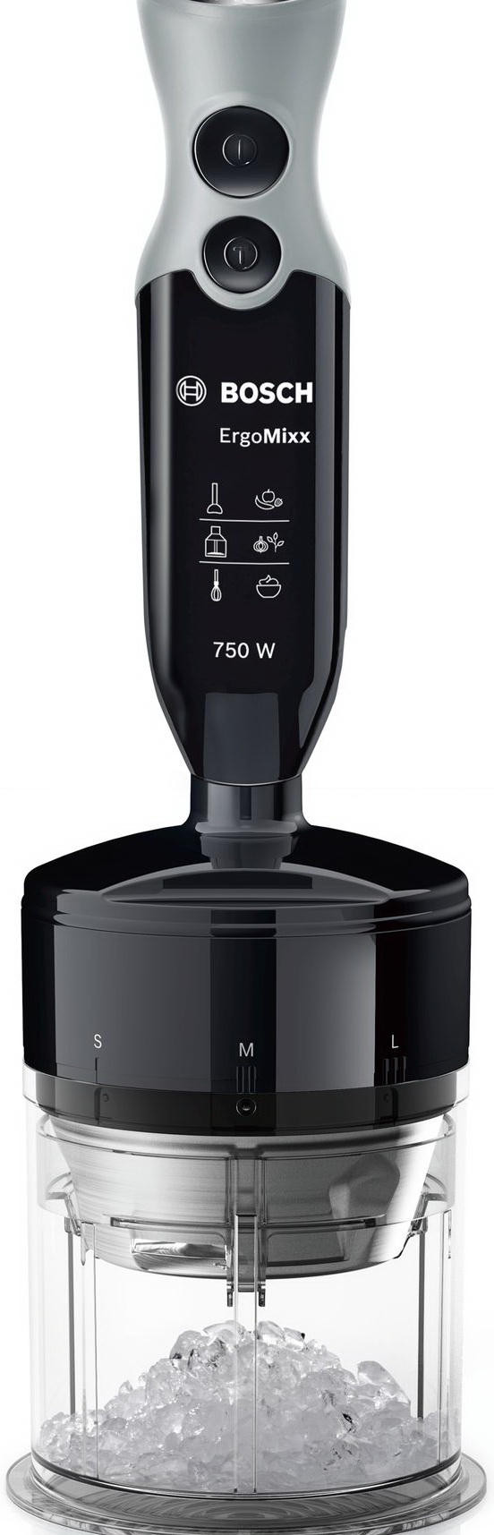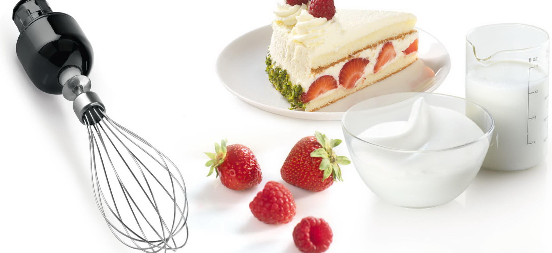 Присоединение металлической ножки с 4 лезвиями QuattroBlade дает возможность использовать прибор с мерным стаканом или другой посудой, измельчать и пюрировать овощи и фрукты.