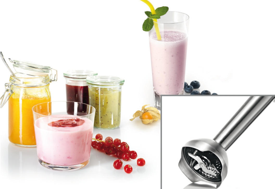 Эргономичная ручка с большими кнопками и мягким антискользящим покрытием легко ложится в руку, насадки удобно менять. Четыре острых лезвия QuattroBlade Pro быстро измельчают продукты, интенсивность обработки можно регулировать при помощи 12 скоростных режимов.