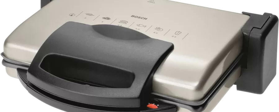 Гриль Bosch TFB3302V — компактная модель мощностью 1800 Вт. Съемные алюминиевые пластины быстро нагреваются, они оснащены стоком для жира. Подвижная верхняя панель позволяет поджаривать толстые куски с двух сторон. Можно также размораживать и подогревать.