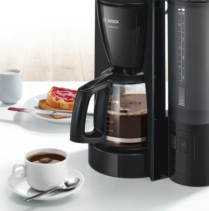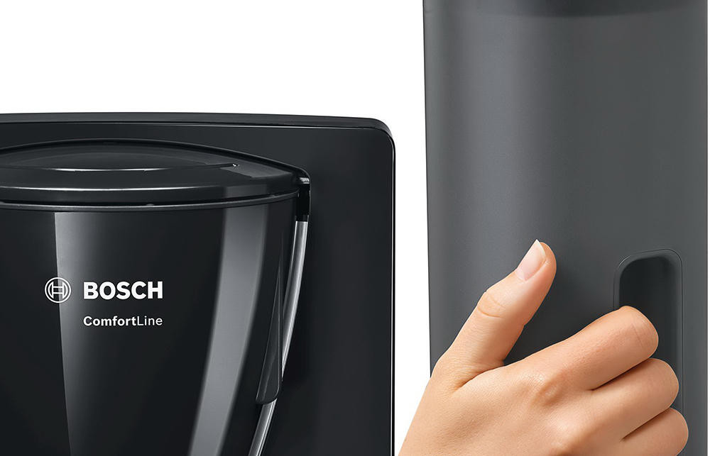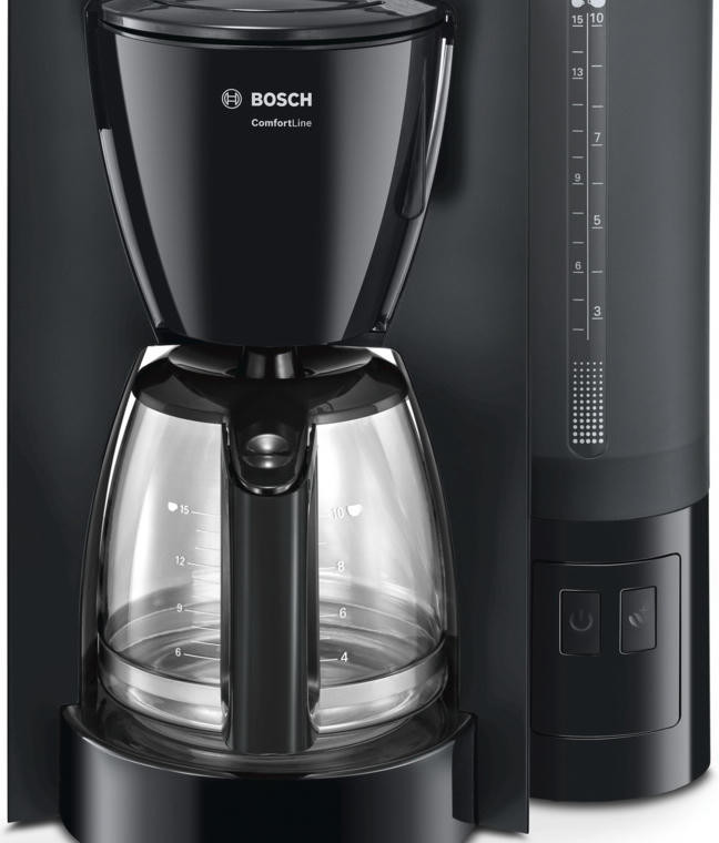 Кофеварка Bosch TKA 6A643 оснащена специальной кнопкой Aroma+button, которая регулирует интенсивность вкуса напитка. Вода заливается в специальный встроенный контейнер со шкалой. Прибор снабжен функцией автоматического отключения через 20, 40 или 60 минут.