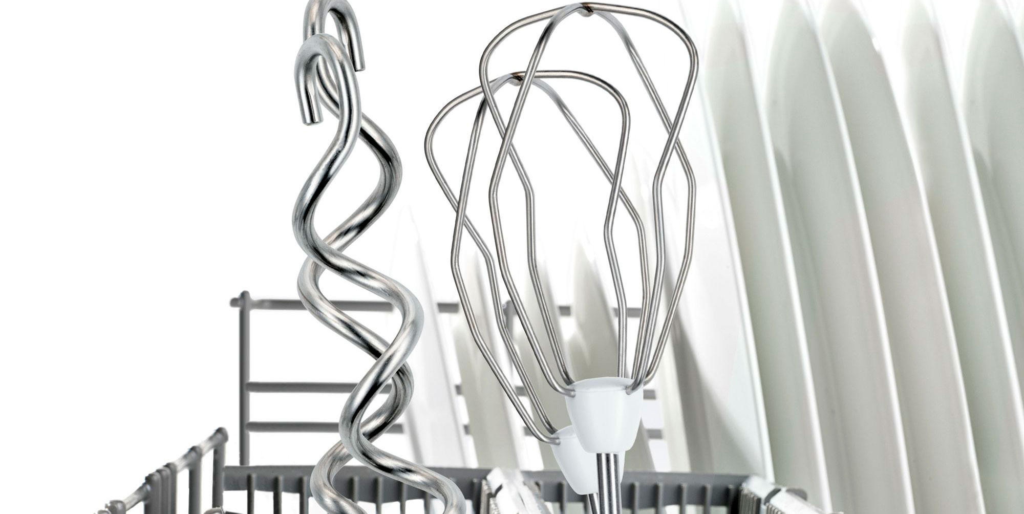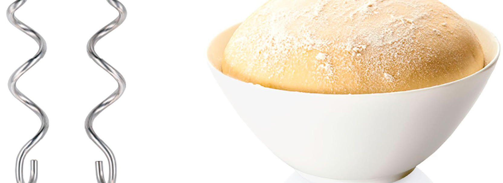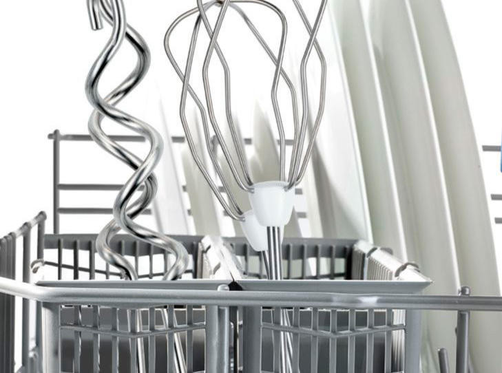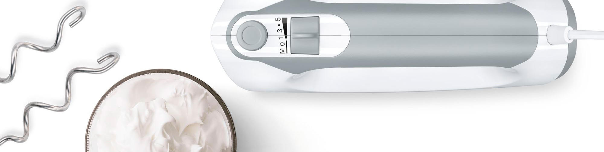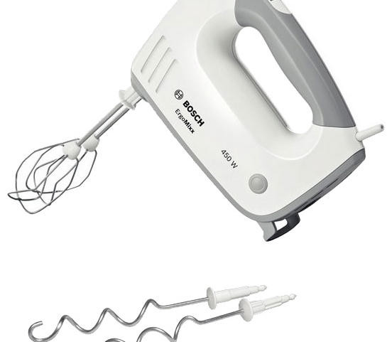 Выполнен в сочетании серого и белого цвета. Имеет 5 скоростей и дополнительный турборежим. В комплекте идут 4 насадки: 2 венчика для взбивания и 2 крючка для замешивания теста.