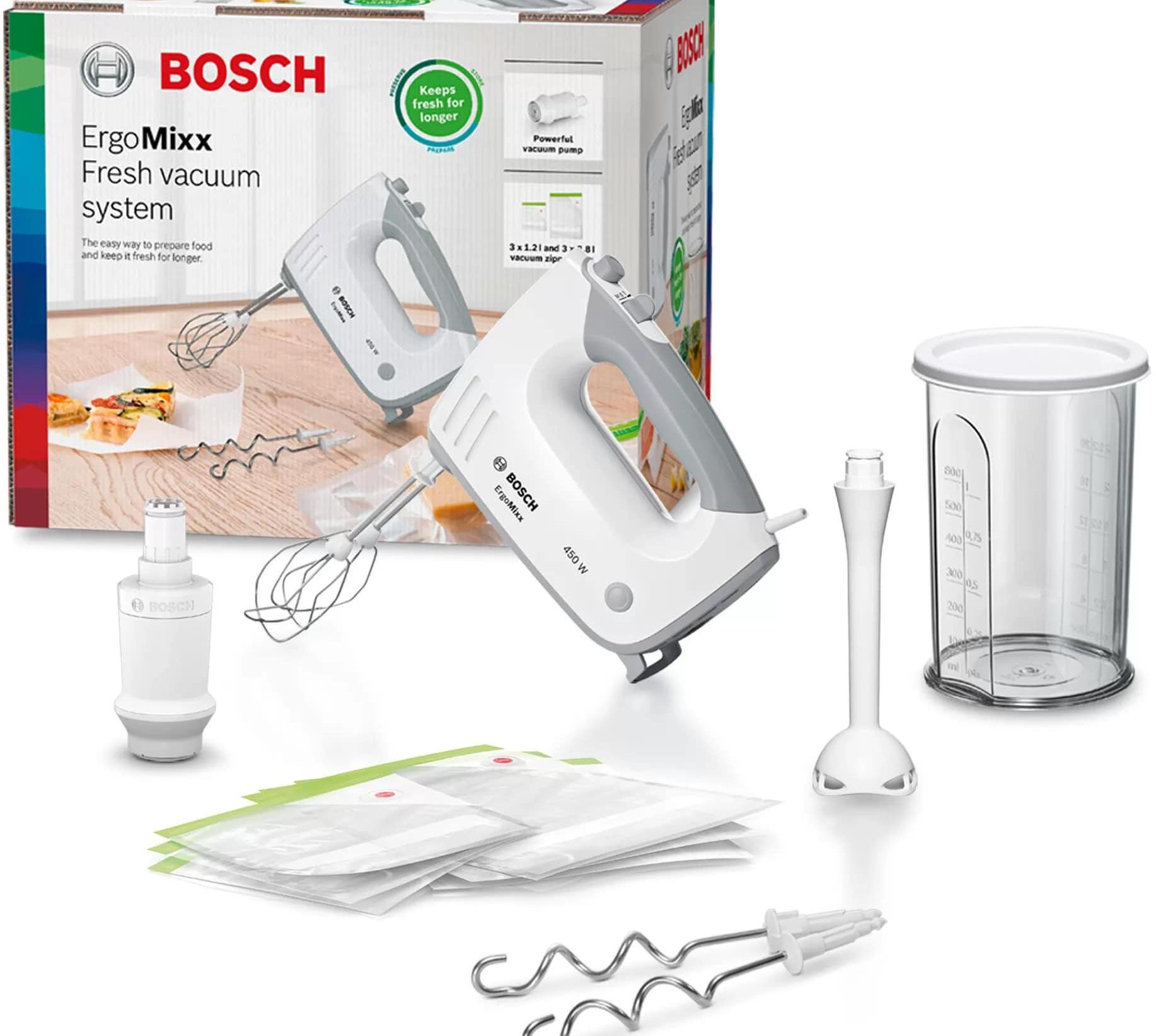 Миксер Bosch MFQ364V0 относится к линейке ErgoMixx и обладает удобной эргономичной ручкой с мягким покрытием Soft-touch и большими кнопками. В приборе имеется функция вакуумирования с 3 пакетами объемом 1,2 и 3,8 л. Ножка блендера из термоустойчивого пластика с ножами из нержавеющей стали легко взобьет или пошинкует различные продукты. Используя пять скоростных режимов, вы можете смешать любой ингредиент до желаемой консистенции, от низкой скорости для смешивания до максимальной для взбивания яичных белков.
