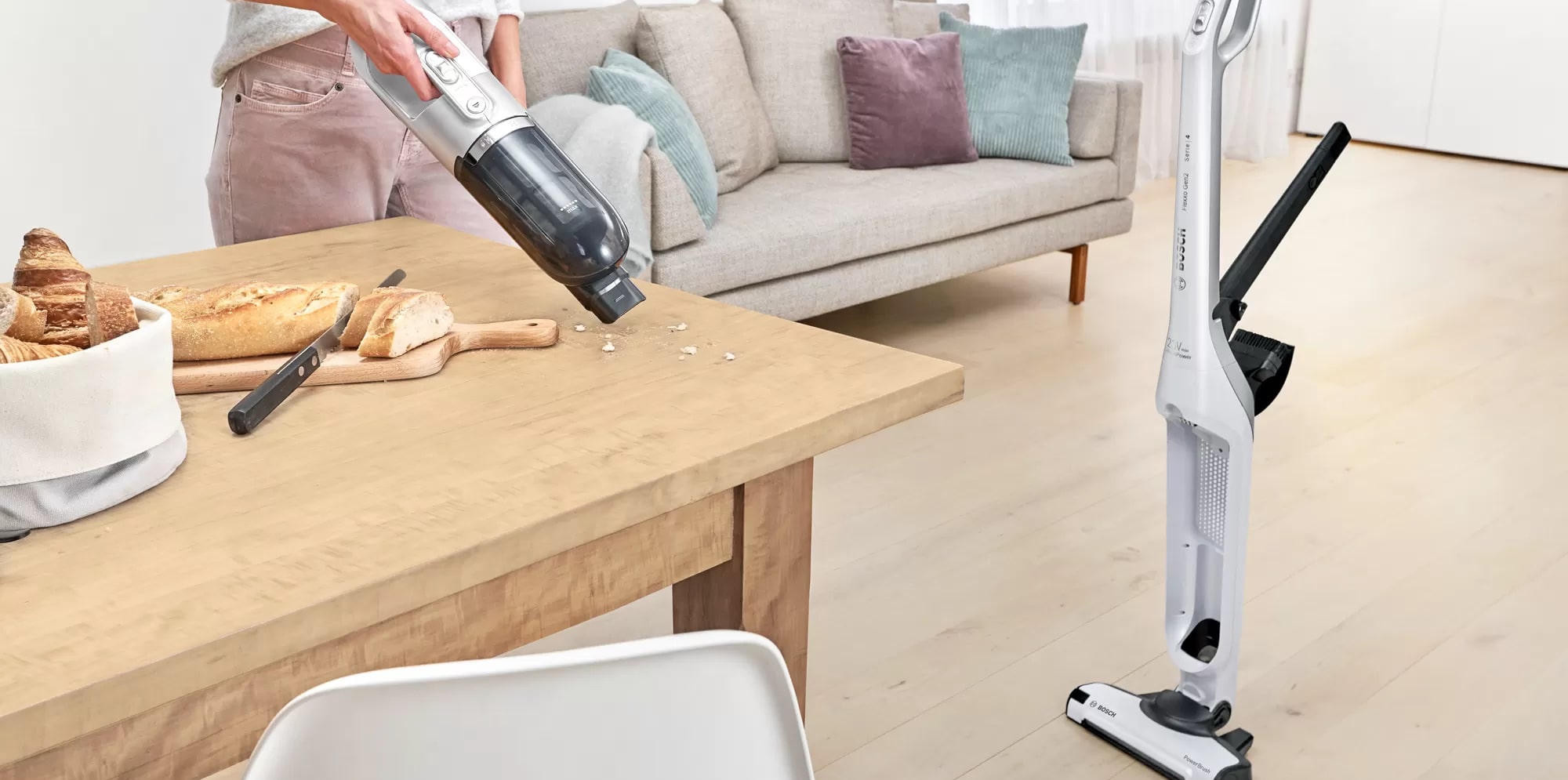 Пылесос Bosch BCH3P2301 занимает минимум места при хранении, ведь расположить его можно вертикально. При этом со своей главной задачей — уборкой в помещении, справляется прибор великолепно. Одного полного заряда аккумулятора достаточно, чтобы устройство до 50 мин работало без подключения к розетке. Конструкцию можно разбирать, чтобы получить портативную модель для уборки в труднодоступных местах, включая салон автомобиля.