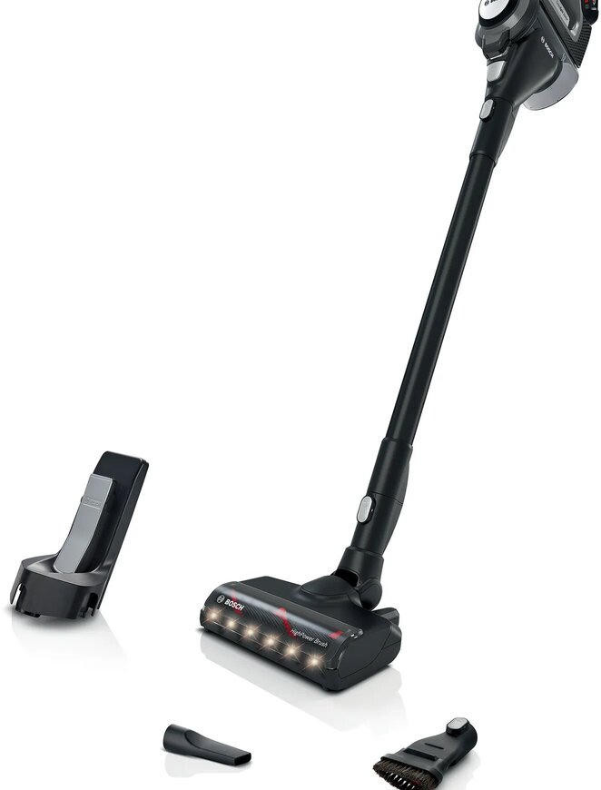 Пылесос Bosch BCS82G31 оснащен съемным универсальным аккумулятором Power for ALL 18 В, он подходит для разных приборов и держит время подзарядки до 45 минут. Имеется турбощетка HighPower с LED подсветкой, она отлично справляется с любыми напольными покрытиями. Также есть режим авто, он будет регулировать мощность работы в зависимости от напольного покрытия.
