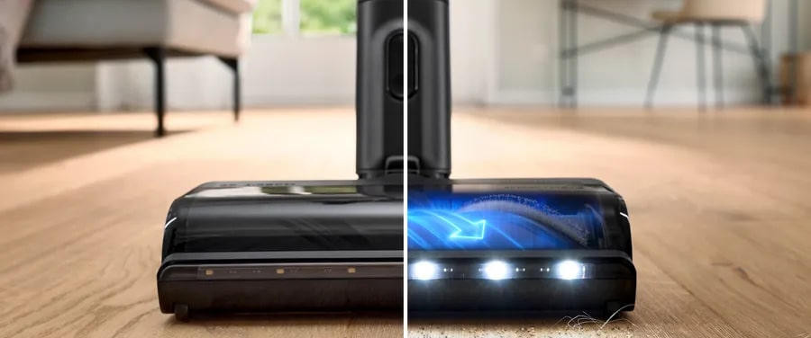 Вертикальный тип пылесоса и безмешковая технология сбора пыли обеспечивают удобство и простоту эксплуатации. Объем контейнера для сбора пыли составляет 0.4 литра, что позволяет проводить уборку без частых перерывов на опорожнение контейнера. Система гигиенической фильтрации контейнерного типа HEPA гарантирует отсутствие мельчайших частиц пыли в воздухе после уборки. Особенностью данной модели является функция 2 в 1: это вертикальный пылесос и съемный портативный пылесос в одном устройстве. Это позволяет быстро и легко переключаться между режимами уборки, в зависимости от потребностей. Регулятор мощности на ручке и три уровня производительности позволяют выбрать оптимальный режим для каждой конкретной задачи.