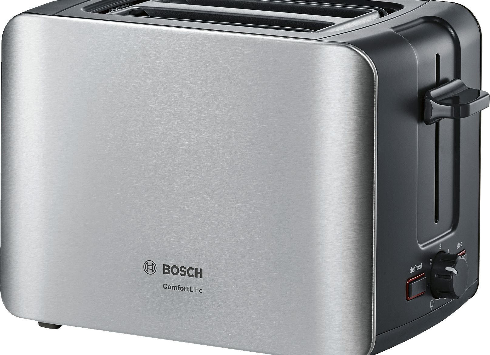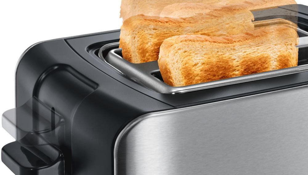 Тостер Bosch TAT6A913 — компактная модель из нержавеющей стали. Автоматическое центрирование тостов и функция разморозки делают использование удобным. Высокий подъем решетки в слотах помогает извлекать небольшие ломтики хлеба.