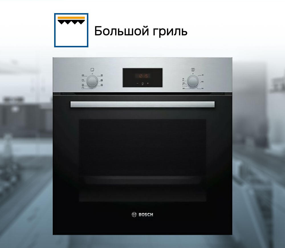 Духовой шкаф Bosch HBF133BR0 — это электрическая независимая модель. Она выполнена в цвете «нержавеющая сталь», благодаря чему отлично вписывается в современный кухонный интерьер. Ее внутренний объем составляет 66 литров, благодаря чему есть возможность запекать большие блюда. Управление осуществляется посредством нажатия кнопок, поворота переключателей, а также использования сенсорных кнопок. Благодаря многофункциональным часам Easy Clock можно с легкостью отслеживать время до окончания работы одной из программ. LED-дисплей имеет высокое качество изображения и устойчив к высоким температурам. Откидная дверца с двухслойным стеклом надежно удерживает пар внутри. Имеются телескопические направляющие, благодаря которым противень легко выдвигается, а риск получения ожога снижен..