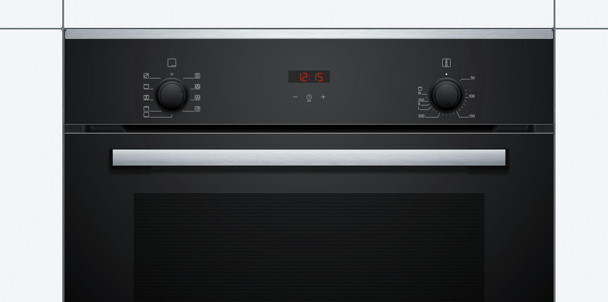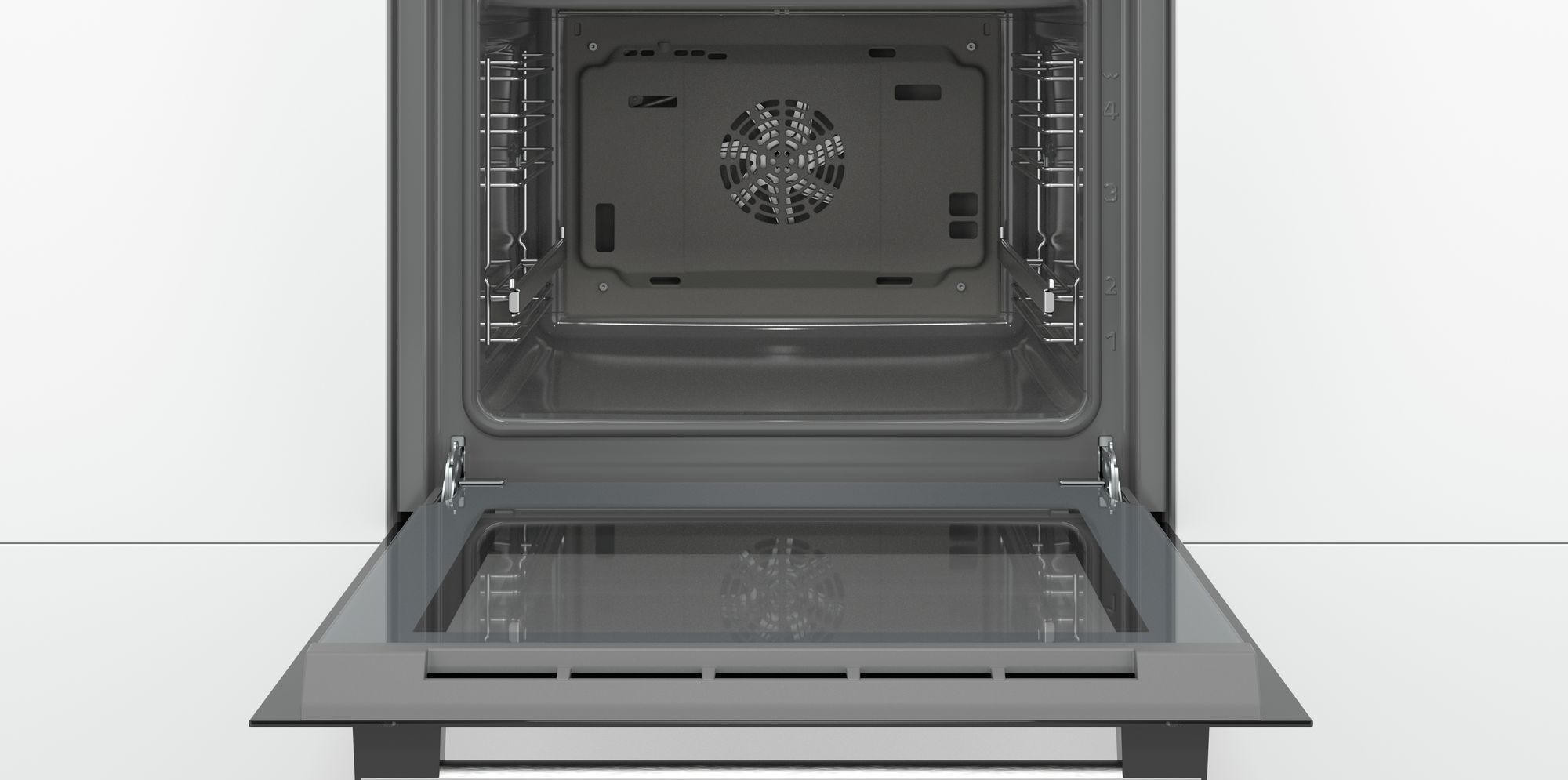 На панели управления расположены часы, которые при помощи сенсора переводятся в режим таймера. Ими также можно задать время приготовления блюда или время окончания готовки. Регулятор температуры позволяет установить степень нагрева от 50 до 275 _C. Бош HBF234EB0R включает в себя восемь режимов нагрева. В их число входит конвекция, позволяющая использовать горячий воздух в щадящем режиме. Это так называемый «умный» вид нагрева, используемый для приготовления мяса и рыбы. С его помощью прекрасно получается выпечка из дрожжевого теста, бисквиты и пирожные. Доступно также размораживание продуктов.