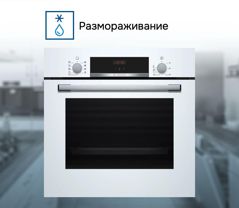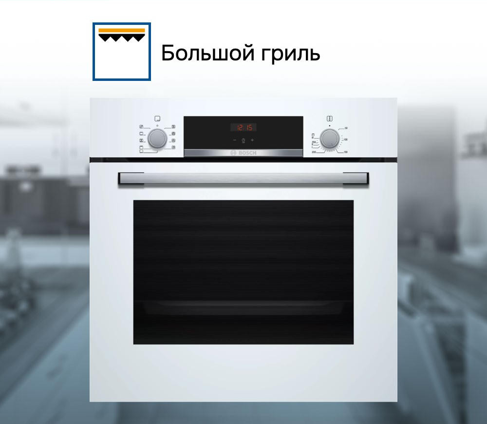 Духовой шкаф Bosch HBF534EW0Q из серии Serie | 4 — это удачное сочетание нейтрального дизайна и продуманной функциональности. Его светлый корпус с акцентами из нержавеющей стали выглядит свежо и современно, легко вписываясь в интерьеры любого стиля — от скандинавского минимализма до тёплой классики. Такое решение не только подчёркивает эстетику кухни, но и создаёт ощущение лёгкости и уюта.