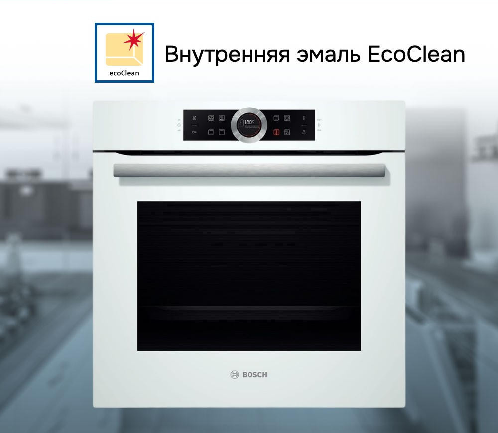 Внутренние поверхности в Бош HBG634BW1 изготовлены из самоочищающихся панелей EcoClean (задняя стенка) и покрыты антрацитовой эмалью высокой очистки (боковые). Таким образом уход за духовкой не составит большого труда.
