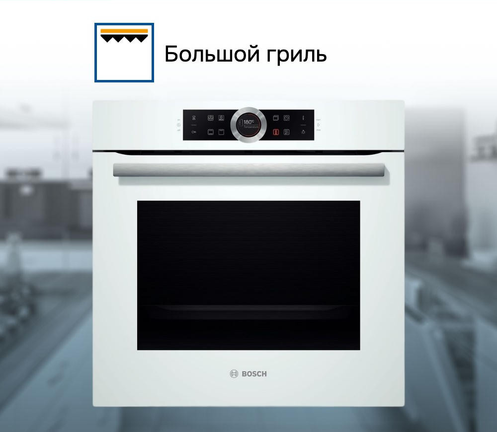 Духовой шкаф Bosch HBG634BW1 оснащен эргономичной панелью управления с поворотным переключателем Control Ring. Сенсорный дисплей с отображением меню, включающим все возможные подсказки и советы. Дополнительная кнопка «Info» значительно упростит выбор режима.