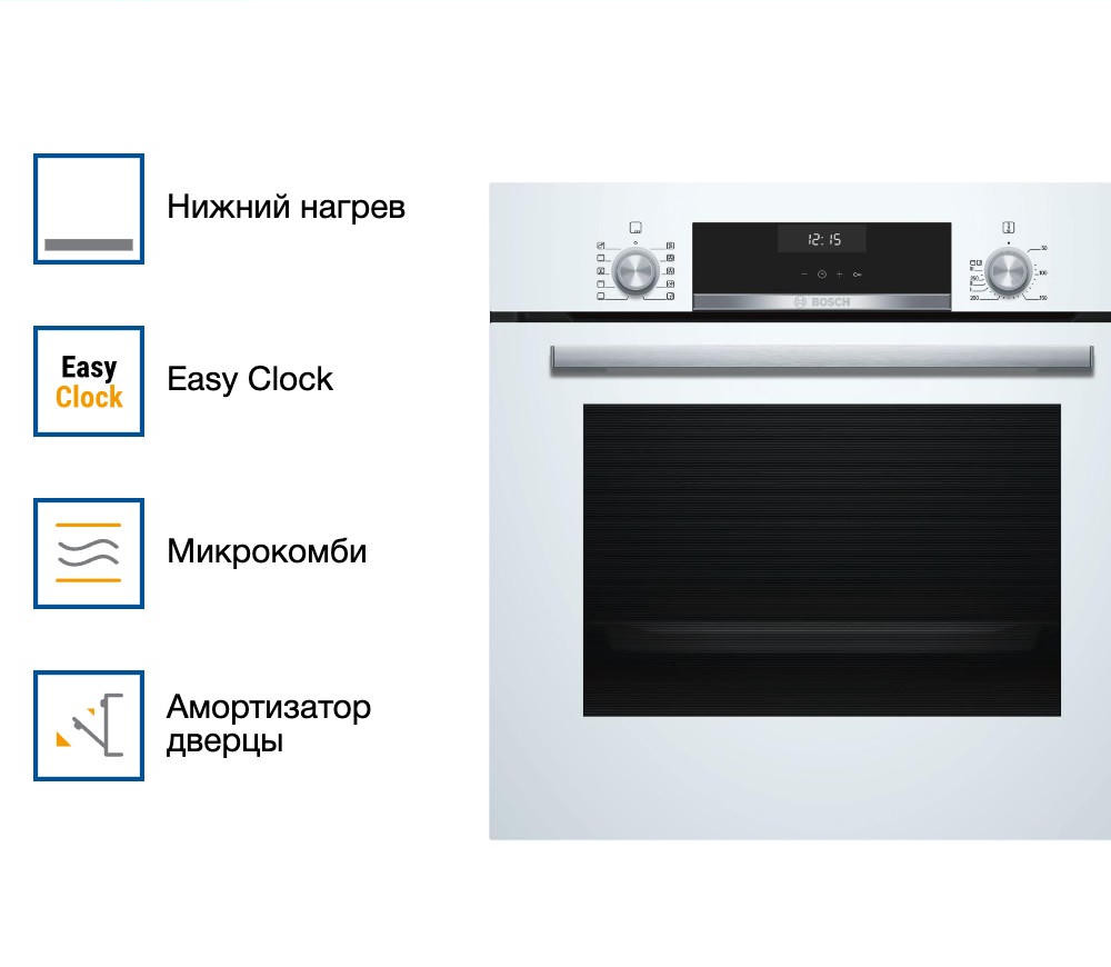 Духовой шкаф Bosch HBJ558YW0Q оснащен 8 режимами нагрева, среди которых — гриль, конвекция и размораживание. В камере предусмотрено пять уровней установки противней, на двух из них установлены телескопические направляющие. Наружное стекло нагревается не более чем до 40_С. В комплект входит комбинированная решётка и два противня (эмалированный и универсальный, противень для гриля).