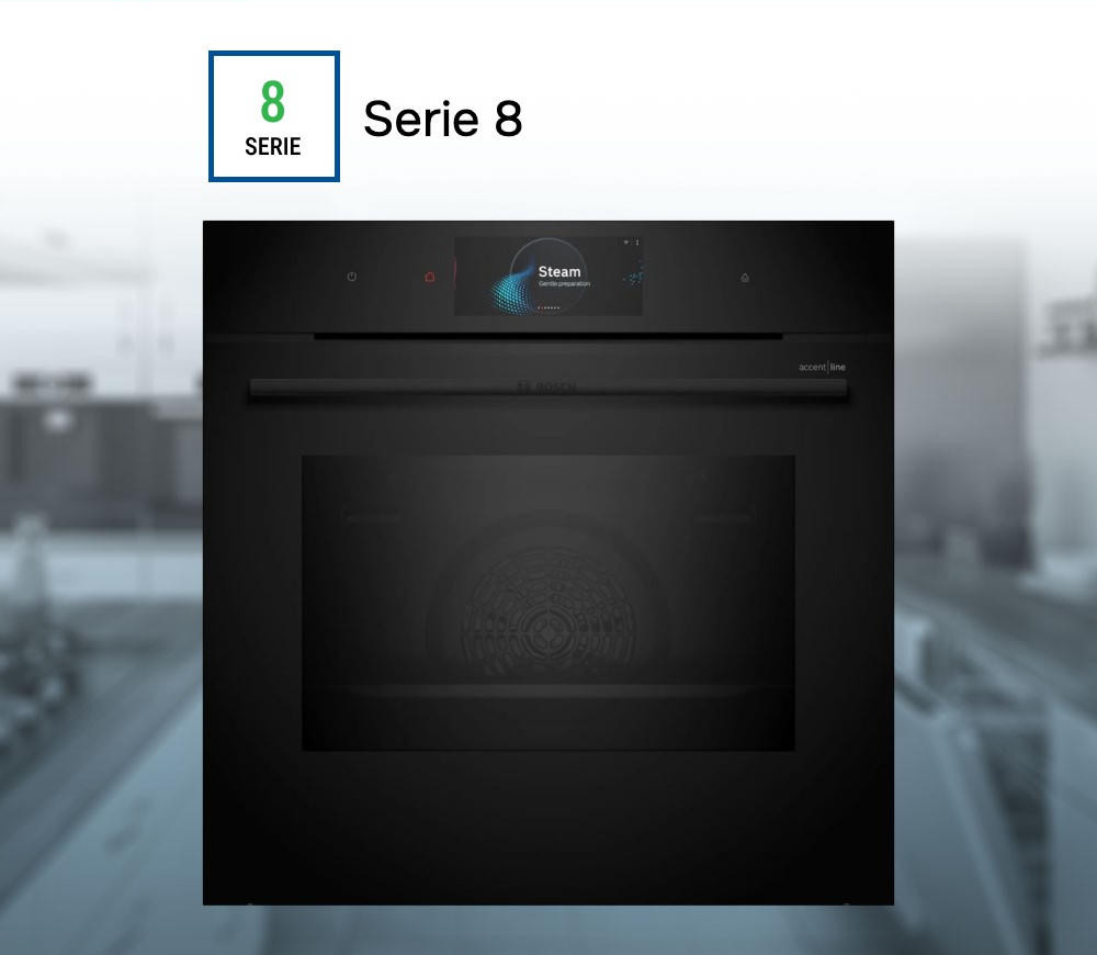Духовой шкаф из серии Serie | 8 — это не просто прибор, а настоящий кулинарный партнёр. Его глубокий чёрный корпус выглядит утончённо и дорого, а лаконичный фасад легко вливается в любой интерьер — от минималистичной кухни до роскошной классики. Внутри у него просторно: даже на праздники или когда в гости приходят родные, вы спокойно разместите несколько блюд сразу, не устраивая перестановку в процессе готовки.