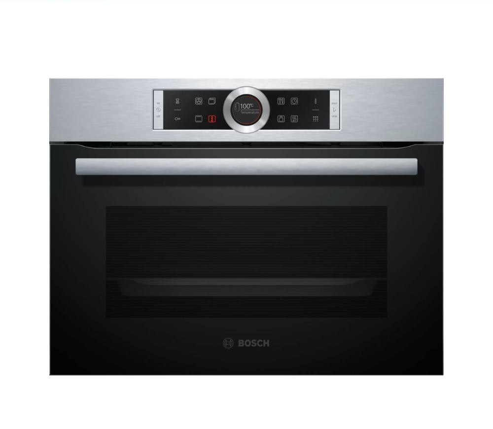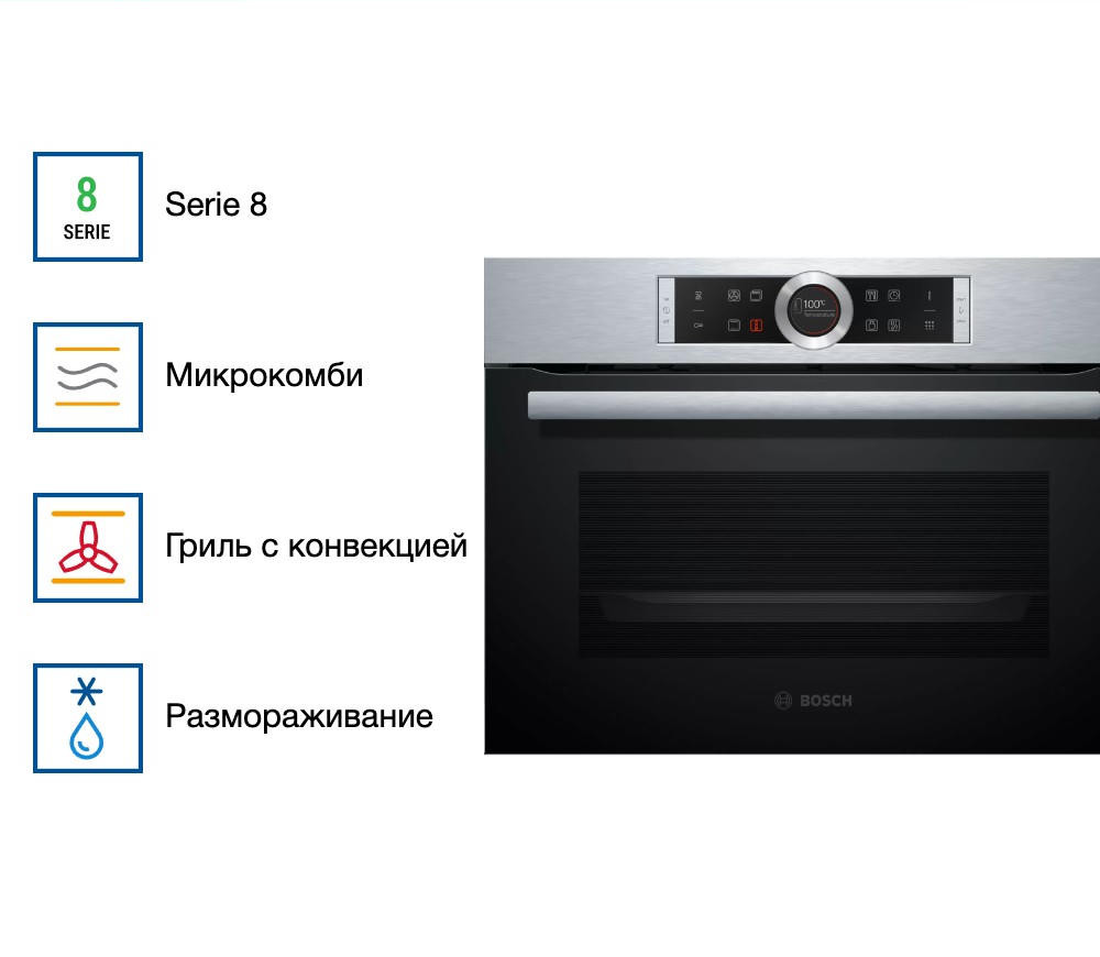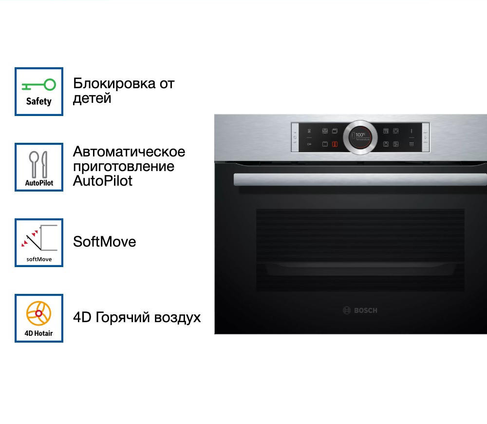 Компактный электрический духовой шкаф Bosch CBG675BS3 - это высокотехнологичный прибор, который сочетает в себе стильный дизайн и передовые функциональные возможности. Отличительной чертой является компактность прибора, что позволяет его удобно разместить даже на небольшой кухне. Дизайн духового шкафа выполнен в строгом и современном стиле. Отделка из нержавеющей стали придает прибору элегантность и делает его устойчивым к коррозии. Прибор оснащен электронным управлением с сенсорными переключателями Control Ring, что обеспечивает удобную и точную настройку режимов работы. Особенности функционала этой модели впечатляют. Прибор обладает внушительным количеством режимов нагрева - целых 13, включая 4D-горячий воздух, верхний/нижний жар, большой и малый гриль, режим для пиццы, бережное тушение, подогрев посуды и даже автоматическое приготовление AutoPilot. Внутренний объем шкафа составляет 47 литров, что позволяет готовить большие порции еды одновременно. Температура нагрева может варьироваться в диапазоне от 30 до 300 градусов Цельсия, что позволяет точно настроить температурный режим для каждого блюда.