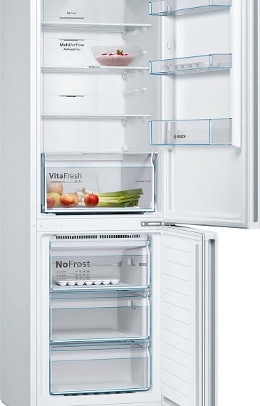 Двухкамерный холодильник Bosch KGN36NW21R — модель из линейки Serie | 4, выполненная в белом цвете. Модель имеет 2 отделения, общий полезный объем составляет 324 л. Холодильная камера расположена сверху и имеет полезный объем 279 л, в то время как морозильник располагается снизу и имеет полезный объем 87 л. Габариты прибора оптимальны — 186x60x66 см (В х Ш х Г): можно установить плотно к стенам и мебели, избежав зазоров сзади и по бокам. Двери открываются на 90°, позволяя полностью выдвигать полки и ящики.