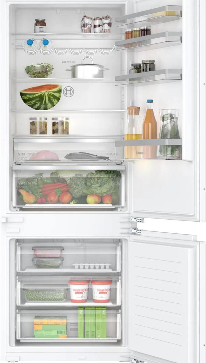 Холодильная часть использует динамическую систему охлаждения в сочетании с MultiAirflow, что обеспечивает однородный поток воздуха по всему объему и помогает поддерживать стабильную температуру на каждом уровне. Система автоматического размораживания освобождает от необходимости ручного обслуживания, а зона VitaFresh предназначена для продления срока хранения овощей, фруктов и мясных продуктов, сохраняя структуру и витамины дольше обычного.