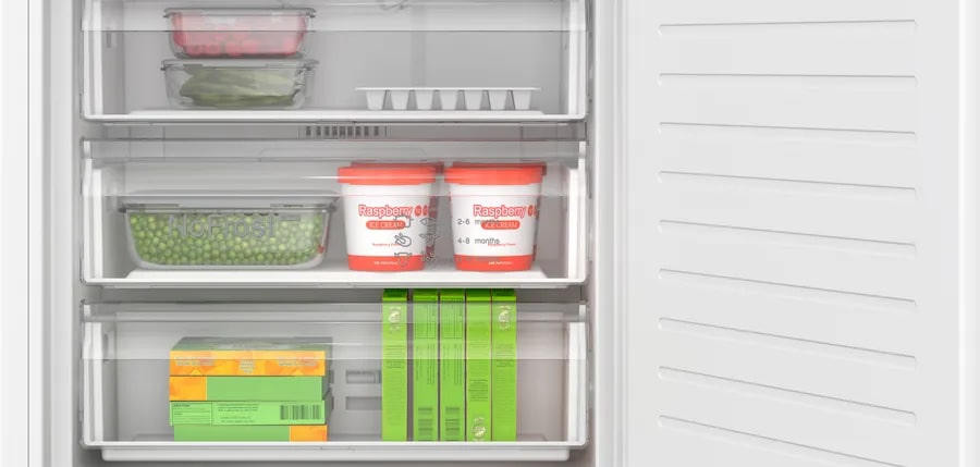 Морозильная камера реализована по технологии NoFrost, полностью исключающей образование инея внутри, и также оснащен автоматической системой размораживания. Функция SuperFreezing (суперзамораживание) оперативно снижает температуру при загрузке свежих продуктов, а мощность замораживания 9.5 кг/24 ч обеспечивает быстрое превращение продуктов в безопасные для длительного хранения порции. При отключении питания автономное сохранение холода достигает 13 часов, что даёт дополнительную защиту содержимого.