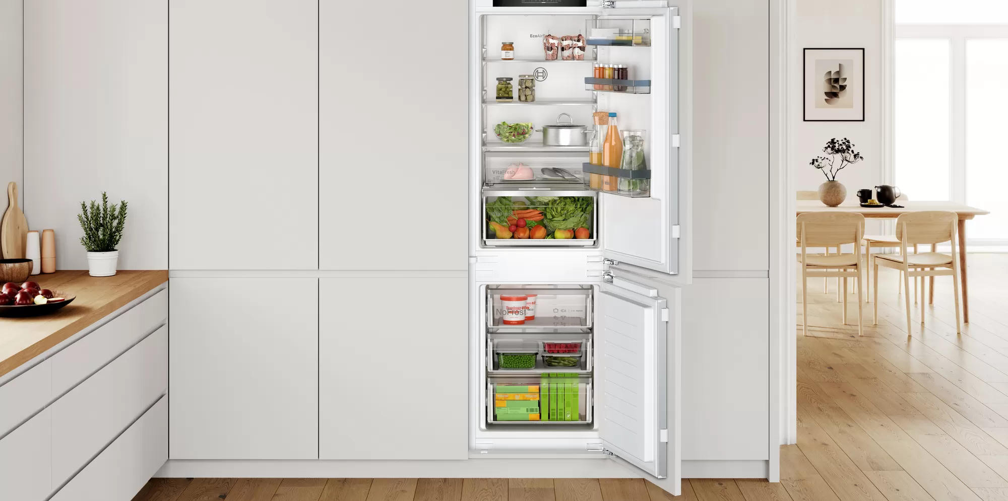 Встраиваемый двухкамерный холодильник Bosch KIN86VFE0 - это высококачественная техника, произведенная в Евросоюзе, которая сочетает в себе функциональность и стильный дизайн. Белый цвет корпуса придаёт ему элегантность и позволяет гармонично вписаться в любой интерьер кухни. Модель оснащена двумя камерами - холодильной и морозильной, расположенной снизу, общим полезным объемом 260 литров, что делает ее идеальным выбором для средних и больших семей.