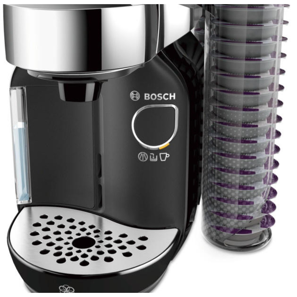 Кофемашина Bosch TAS 7002 черного цвета из серии TASSIMO CADDY — прибор для приготовления напитков из T-дисков. К данной модели прилагаются два интегрированных держателя, каждый из которых рассчитан на 16 капсул. Всего вокруг кофемашины можно разместить 8 держателей (128 капсул), что удобно для офисов, презентаций. Предоставляет большой выбор напитков и позволяет поддерживать чистоту стола, на скатерти не останется пятен от пакетиков или просыпанного кофе. Умная система считывает штрих-код и готовит эспрессо, кафе крема, капучино, латте макиато, горячий шоколад, фруктовый, зеленый и латте чай. Вы можете вручную отрегулировать крепость напитка и размер чашки. О процессе работы извещает световая индикация.