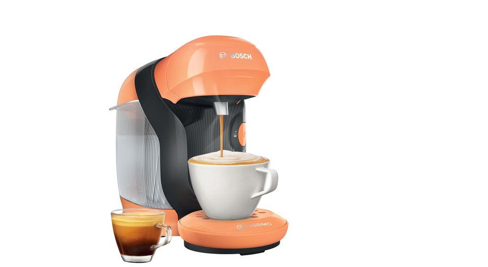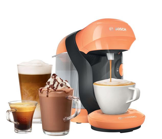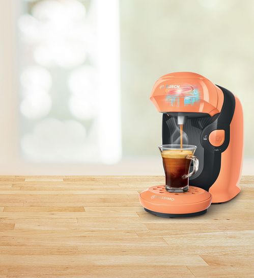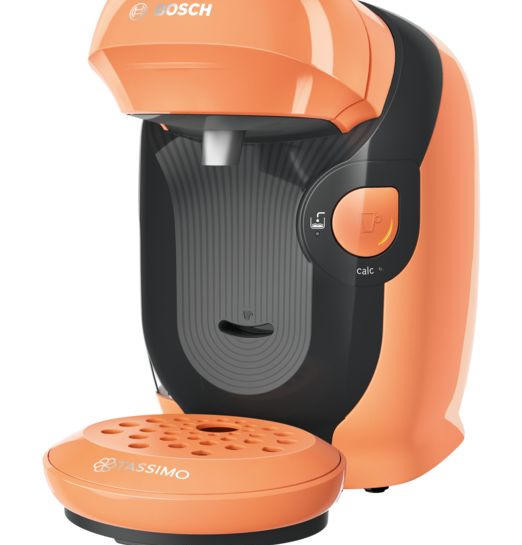 Кофемашина Bosch TAS1106 Tassimo современный дизайн в оранжевом цвете. Модель компактного размера подойдет для любой кухни. Прибор может приготовить множество натуральных и вкусных напитков. Подставка для чашек регулируется по высоте, поэтому можно использовать любую посуду по объему.