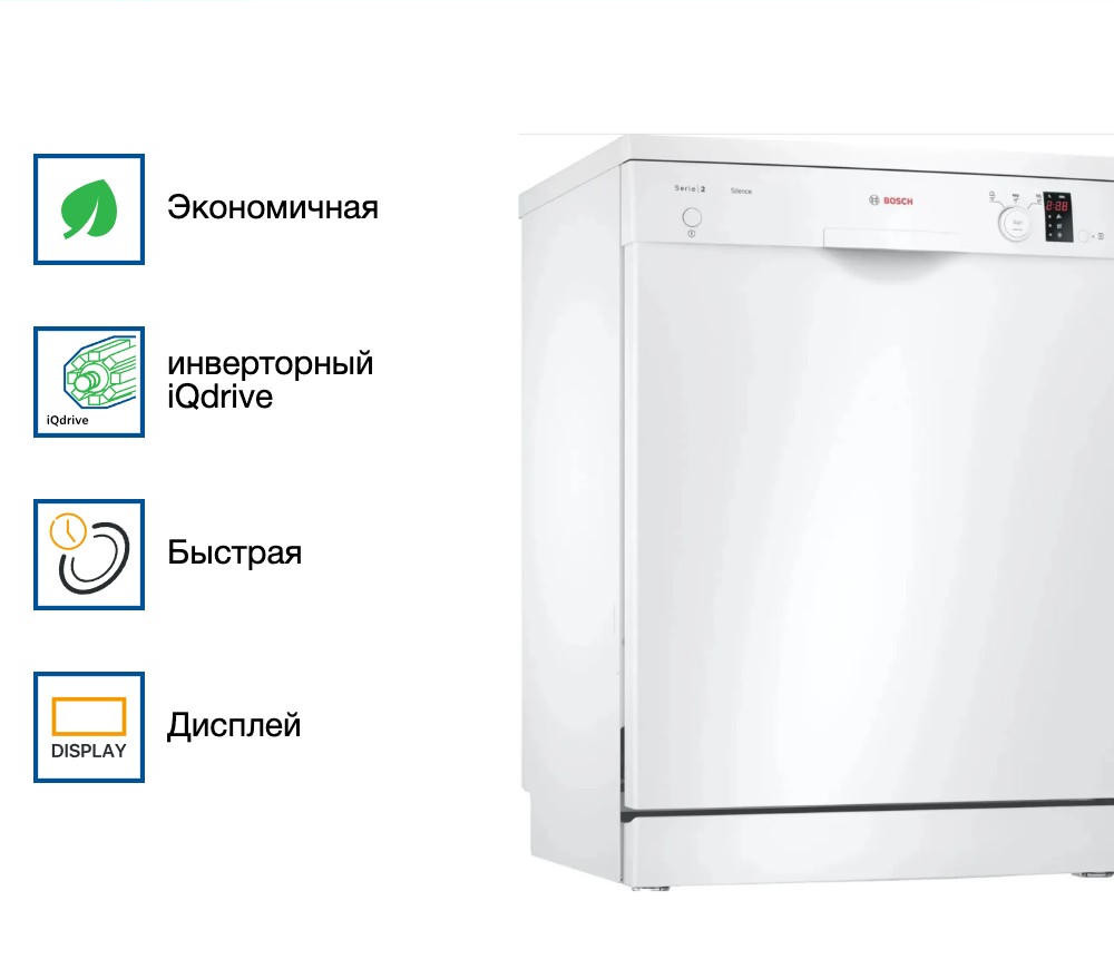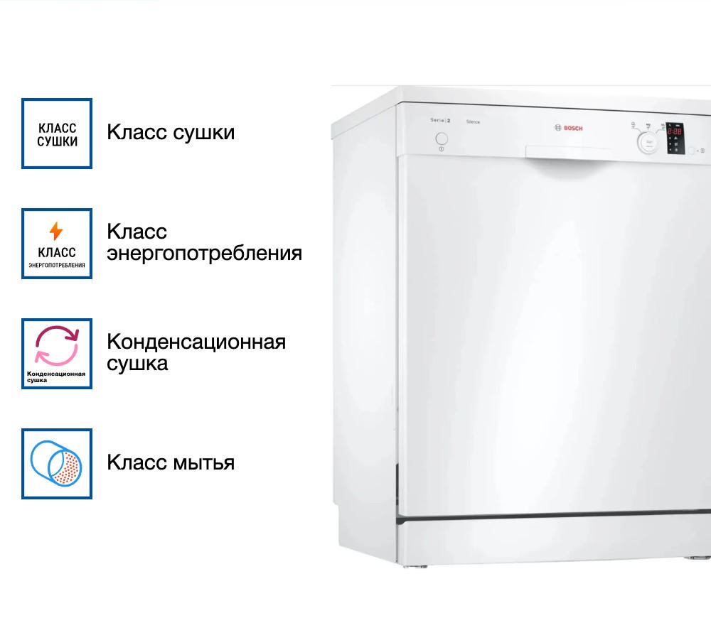 Посудомоечная машина Bosch SMS23DW01T является высококачественной моделью, которая придет на помощь в бытовых делах. Этот аппарат отличается привлекательным внешним видом и функциональностью. Белоснежный корпус придаёт ему элегантности и позволяет гармонично вписаться в любой интерьер. Произведенный в Евросоюзе, этот агрегат обеспечивает надежность и долговечность, что подтверждается гарантией на 12 месяцев от производителя. Стиральная машина отдельностоящего типа, что позволяет установить ее в любом удобном месте. Полноразмерная конструкция обеспечивает возможность мыть большое количество посуды за один цикл. Модель оснащена конденсационной системой сушки, которая обеспечивает эффективное удаление влаги с посуды после стирки.