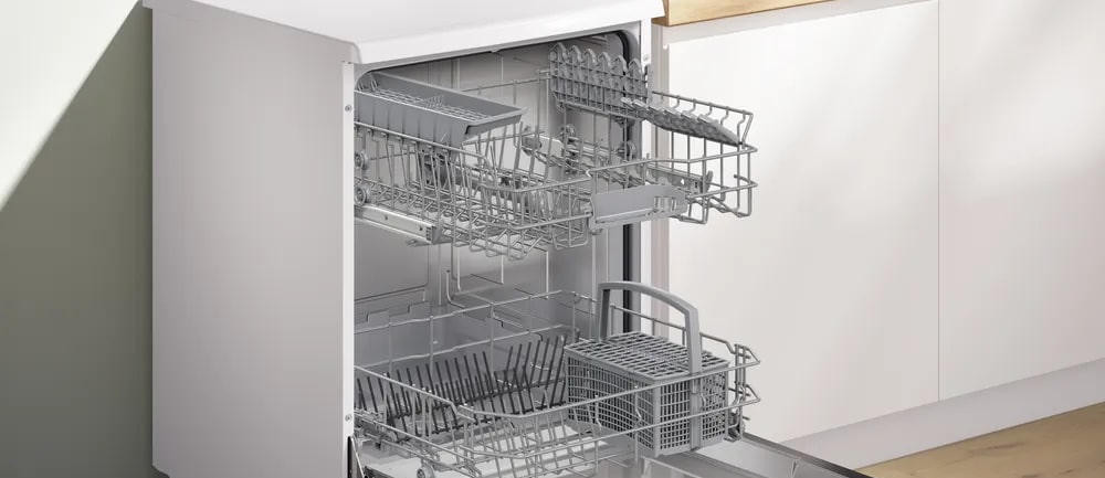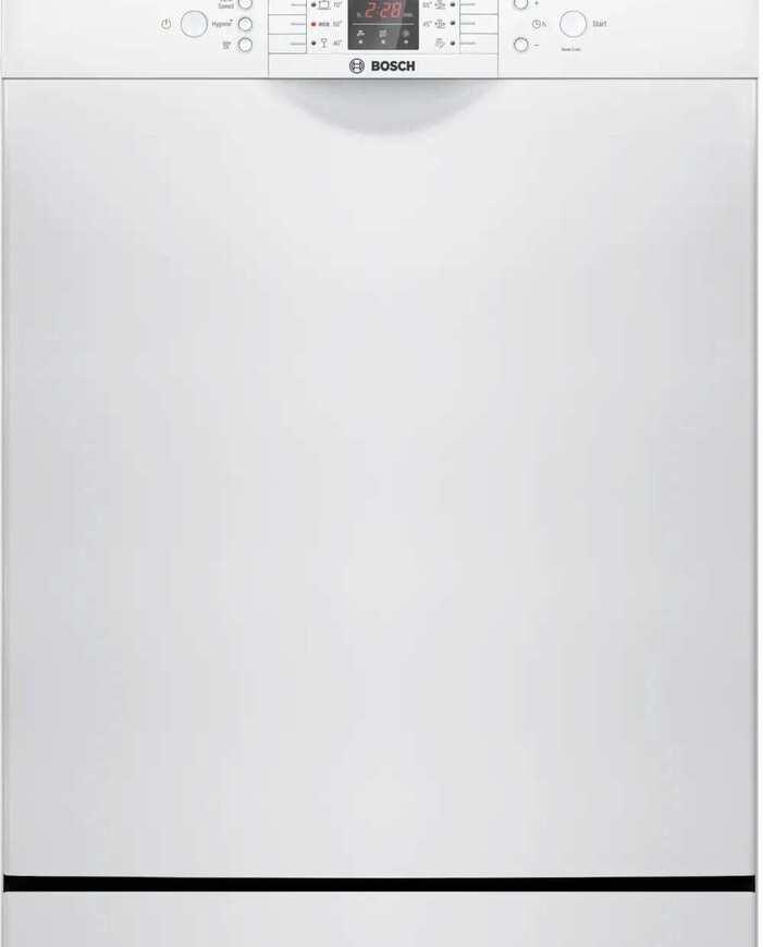 Посудомоечная машина Bosch SMS26AW00Q способна вместить до 12 комплектов покрывает потребности небольшой семьи или пары, при этом комплектность корзин — две полные секции с регулируемой по высоте верхней корзиной на системе Rackmatic-3 — упрощает размещение высоких бокалов, кастрюль и тарелок. В верхнем ящике предусмотрены складные держатели для тарелок (две секции), нижняя камера также оснащена двумя складными элементами для посуды, а внизу располагается удобная корзина для столовых приборов. Пять стандартных программ покрывают самые распространенные сценарии эксплуатации, а индикаторы наличия ополаскивателя и соли, а также отображение времени до окончания цикла помогают контролировать расход средств и планировать бытовые задачи. Функция предварительного ополаскивания поддерживает чистоту при отсрочке запуска, которая может быть установлена от 1 до 24 часов, после завершения программа сопровождается звуковым сигналом.
