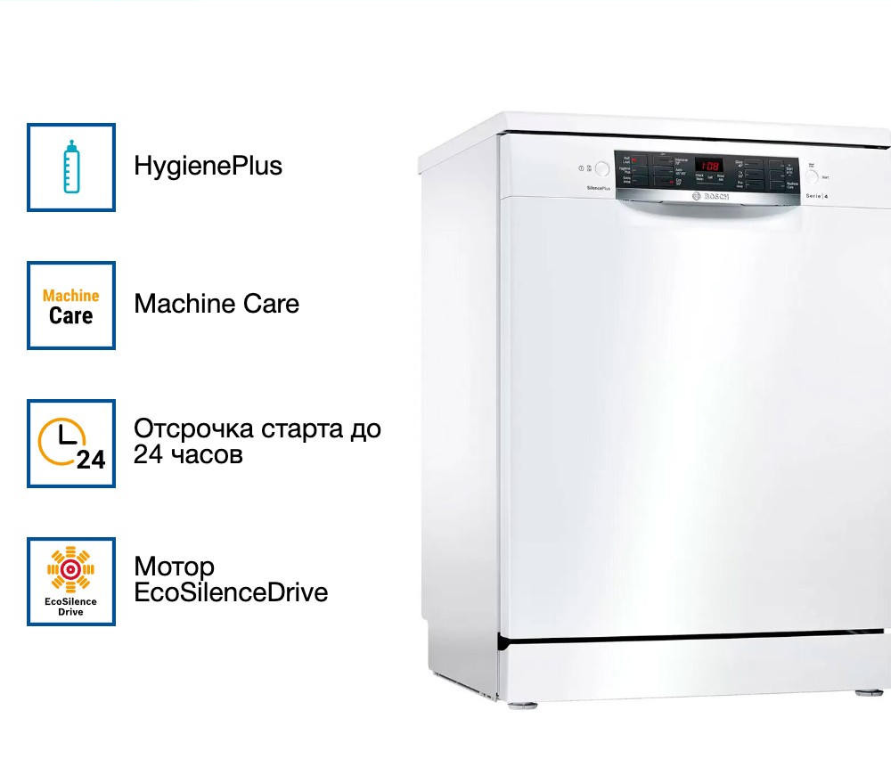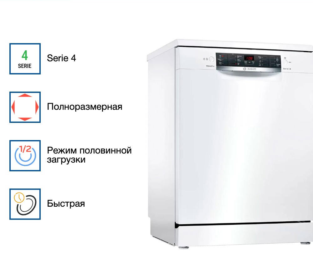 Посудомоечная машина Bosch SMS46NW01B из серии Serie | 4 выделяется лаконичным дизайном и практичной функциональностью. Её светлый корпус с белой панелью управления обладает нейтральной, успокаивающей эстетикой, которая легко вписывается в любую кухню — от современной до традиционной. Такой подход делает технику не просто бытовым прибором, а гармоничной частью интерьера.
