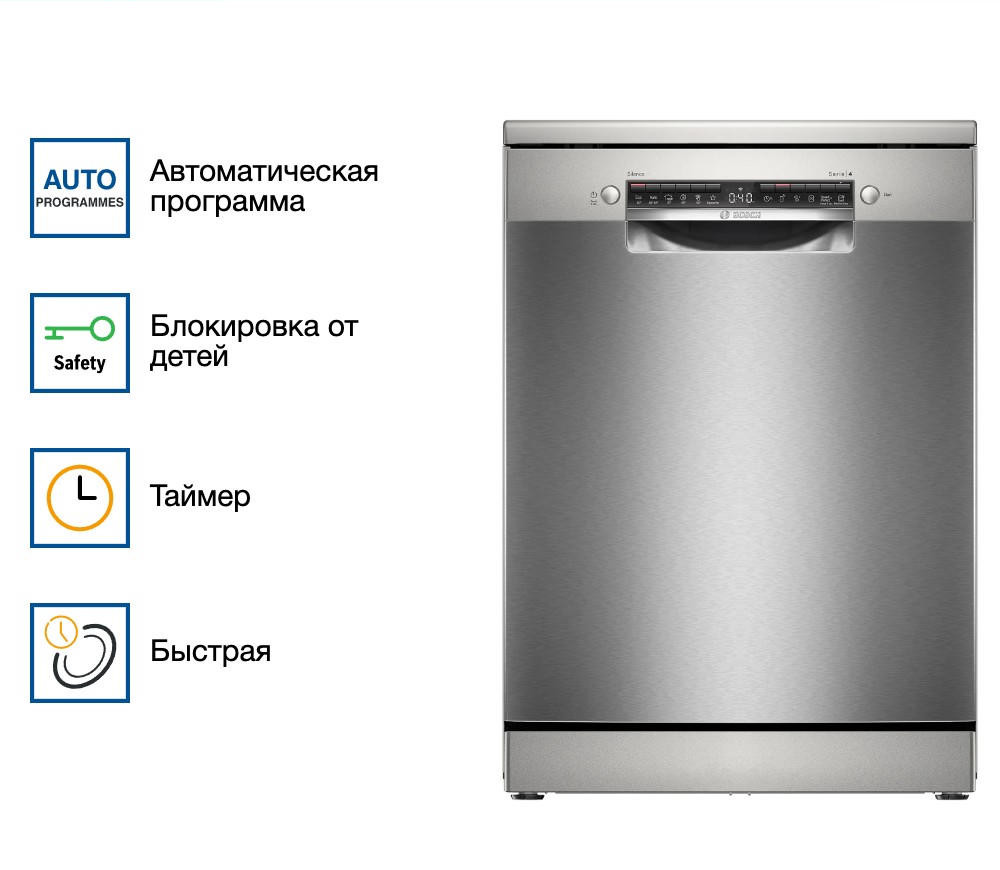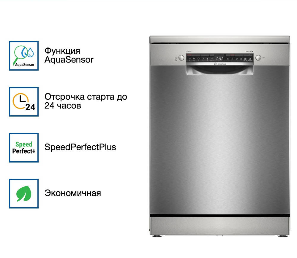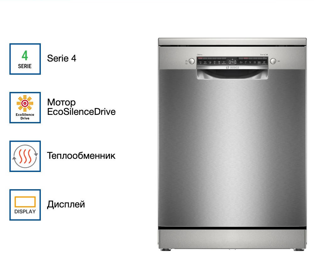 Посудомоечная машина Bosch SMS4HVI00E — идеальное решение для современной кухни. Это отдельностоящая полноразмерная модель, сделанная в Евросоюзе и обеспеченная гарантией на 12 месяцев. Машина выполнена в стильном дизайне из нержавеющей стали с черной панелью управления, что придает ей современное и элегантное очарование. Одно из ключевых преимуществ этой модели — ее инверторный двигатель EcoSilence Drive, обеспечивающий тихую и эффективную работу. Машина способна загружать до 14 комплектов посуды, что делает ее идеальным выбором для больших семей или вечеринок. Bosch SMS4HVI00E оснащена шестью стандартными программами мытья и четырьмя температурными режимами. Среди них есть автоматическая, экономичная, интенсивная, ночная и моя программа. Это позволяет выбрать наиболее подходящий режим в зависимости от типа и степени загрязнения посуды. Кроме того, машина имеет функцию половинной загрузки, что позволяет экономить воду и электроэнергию при малом количестве посуды. Модель имеет функцию SpeedPerfectPlus для быстрого и эффективного мытья, а также программу Machine Care для ухода за машиной. Функция экстра-сушки обеспечивает идеально сухую и блестящую посуду после каждого цикла мытья. Управление машиной осуществляется через открытую панель с кнопками и дисплеем. Также есть возможность удаленного запуска через приложение на смартфоне благодаря функции Home Connect. Это очень удобно, если вы хотите запустить машину, находясь не дома. Машина оборудована тремя корзинами, верхняя из которых переставляется по высоте с помощью системы Rackmatic-3. Это позволяет легко загружать посуду разного размера и формы. Система AquaStop и полная защита от протечек обеспечивают безопасность использования машины. Блокировка от детей предотвращает случайное включение или изменение программы маленькими детьми. Bosch SMS4HVI00E имеет класс энергопотребления D (новый — G), класс мытья A и класс сушки A. Это делает ее эффективной и экономичной в использовании.