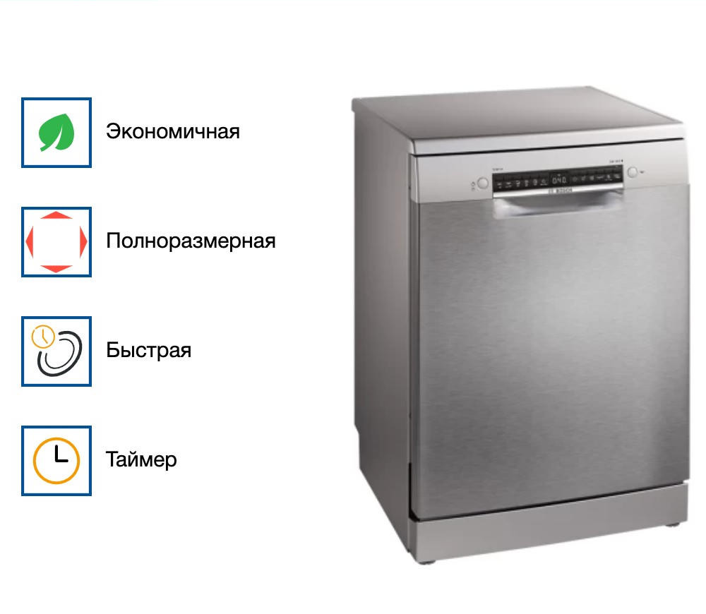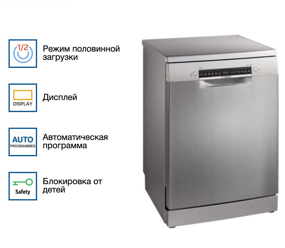 Посудомоечная машина Bosch SMS4IMI62Q — это современная, функциональная и надежная модель, которая станет незаменимым помощником на вашей кухне. Произведенная в Турции, эта машина обладает прочным корпусом из нержавеющей стали, что гарантирует долговечность и стойкость к коррозии. Вместительность модели составляет 14 комплектов посуды, что позволит с легкостью уместить все необходимые кухонные принадлежности. Отдельностоящая конструкция обеспечивает удобство установки и использования машины. Серия Serie | 4, к которой относится данная модель, заслужила признание пользователей за свои высокие технические характеристики и надежность. Система сушки в машине конденсационная, что обеспечивает быстрое и качественное высыхание посуды после мойки. Вместе с инверторным двигателем EcoSilence Drive, который известен своей тихой и эффективной работой, машина обеспечивает отличные результаты мойки при минимальном уровне шума.