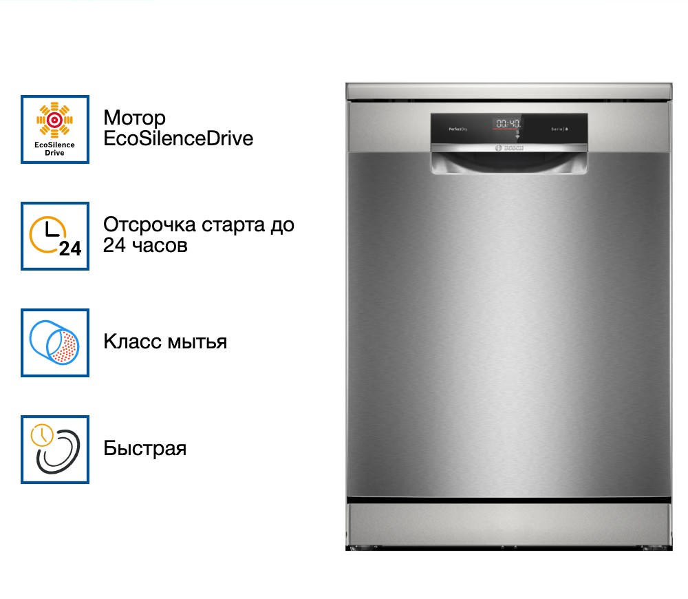 Посудомоечная машина Bosch SMS8YCI03E - это отдельностоящая, полноразмерная модель, выполненная в стильном дизайне из нержавеющей стали. Она принадлежит к серии Serie | 8 и оснащена инверторным двигателем EcoSilence Drive, который обеспечивает тихую и эффективную работу. Эта модель способна разместить до 14 комплектов посуды, что делает ее идеальным выбором для больших семей или активно приглашающих гостей хозяев. Машина оборудована восемью стандартными программами и пятью температурными режимами, включая быструю, экономичную, интенсивную, ночную и специальную программу для стекла при 40 градусах. Это позволяет подобрать наиболее подходящий режим для любого типа посуды. Система HygienePlus гарантирует высокий уровень гигиены, уничтожая до 99,9% бактерий и микробов. Особенностью данной модели является функция VarioSpeedPlus, которая позволяет сократить время мойки в три раза без потери качества. Также стоит отметить функцию Extra Dry, обеспечивающую идеальную сушку даже для трудносушимой посуды, такой как пластиковые изделия. Технология защиты стекла печет о сохранении блеска стеклянной посуды и предотвращения ее повреждения.
