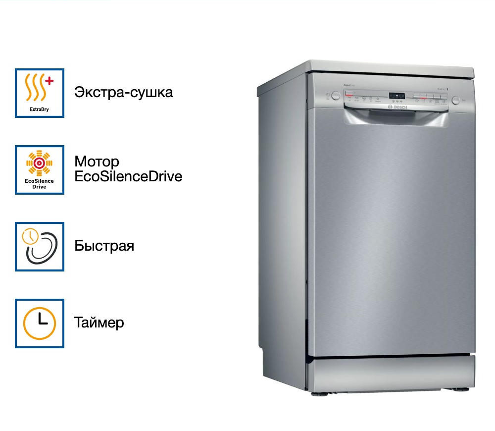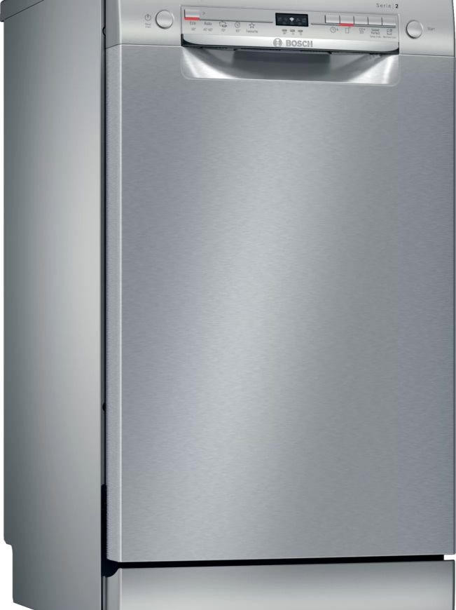 Посудомоечная машина BOSCH SPS2IKI02E выполнена в серебристом цветовом решении. Данный прибор вмещает в себя 9 комплектов посуды. Ширина данного устройства 45 см, что позволит вместить его на любую кухню. Дисплей облегчит эксплуатацию посудомойки.