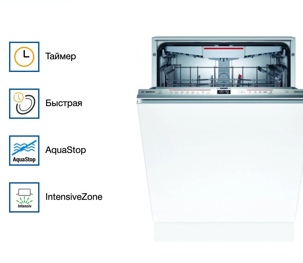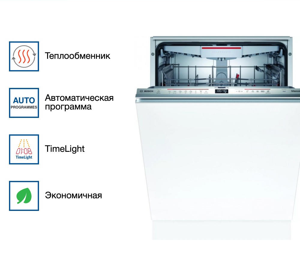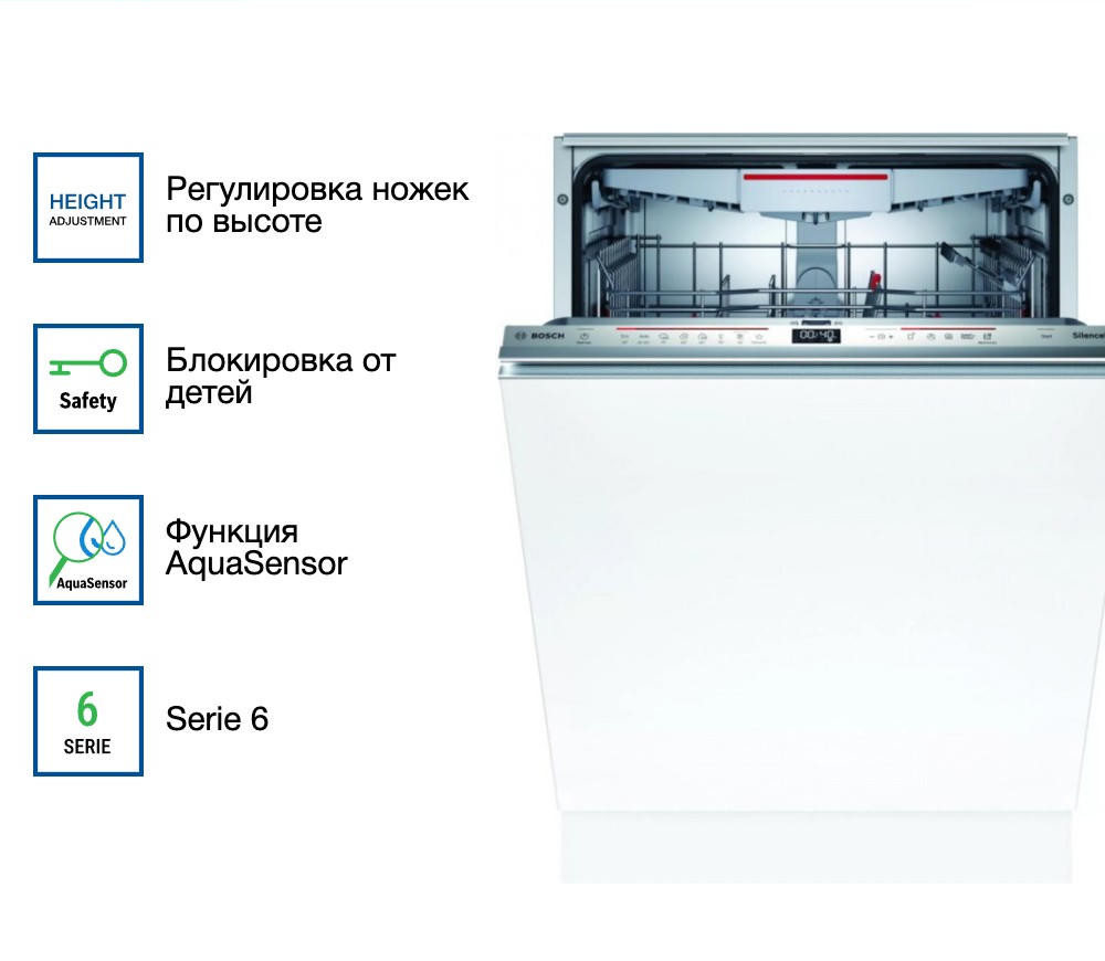 Встраиваемая посудомоечная машина Bosch SBD6ECX57E оснащена полной защитой от протечек, в случае утечки произойдет полное перекрытие воды. Имеется луч на полу InfoLight, он означает что устройство работает. Функция Home connect позволяет дистанционно отслеживать состояние вашего прибора и задавать настройки.