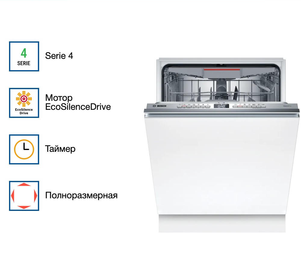 Встраиваемая посудомоечная машина Bosch SBH4ECX10E — это высококачественный и многофункциональный помощник на кухне. Произведенная в Евросоюзе, она отличается превосходным качеством сборки и использованием современных технологий. Дизайн машины выполнен в классическом стиле, что позволяет ей гармонично вписаться в интерьер любой кухни. Панель управления, выполненная из нержавеющей стали, не только придает модели элегантный вид, но и обеспечивает ее долговечность. Машина оснащена инверторным двигателем EcoSilence Drive, который обеспечивает тихую и эффективную работу. Благодаря этому, уровень шума составляет всего 42 дБ, что позволяет использовать машину даже ночью без беспокойства о том, что она помешает отдыху. Вместительность устройства составляет 14 комплектов посуды, что делает его идеальным выбором для больших семей. Машина предлагает шесть стандартных программ мытья и четыре температурных режима, позволяя выбрать наиболее подходящий режим для различных типов посуды и степени ее загрязнения. Особенностью модели является функция VarioSpeedPlus, которая позволяет ускорить процесс мытья до трех раз, сохраняя при этом отличное качество. Также стоит отметить наличие системы AquaStop, которая обеспечивает полную защиту от протечек. Модель оснащена функцией автооткрывания дверцы после окончания программы, что способствует более эффективной сушке посуды. Система Machine Care помогает поддерживать машину в чистоте и продлевает ее срок службы. Посудомоечная машина Bosch SBH4ECX10E оснащена функцией Home Connect, которая позволяет управлять устройством с помощью смартфона. Это очень удобно, так как позволяет запускать и контролировать процесс мытья даже на расстоянии.