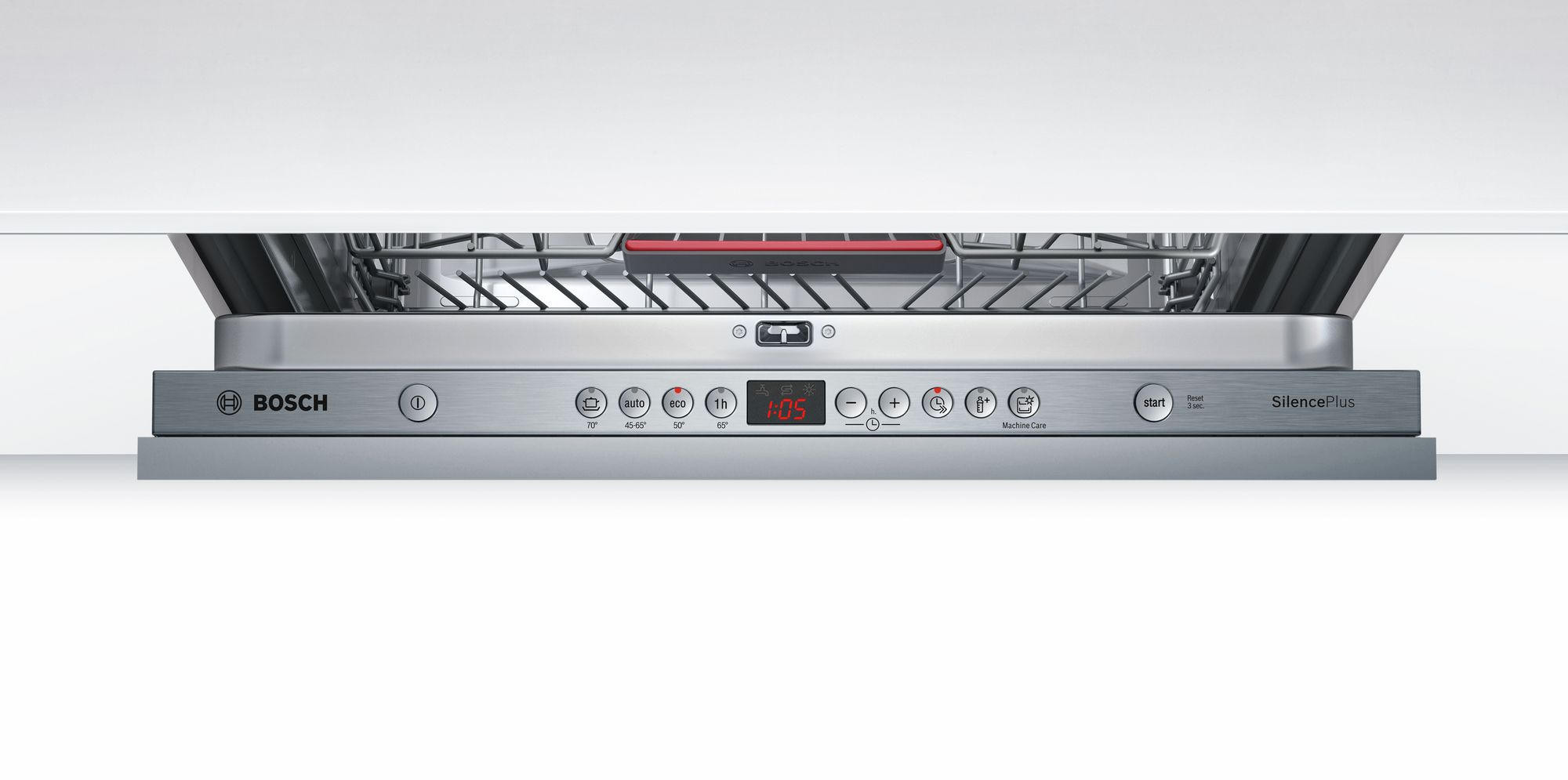 Для того чтобы в нижнем ящике уместились противни или габаритные кастрюли, вторую корзину можно поднять при помощи Rackmatic-3. Функция «Гигиена Плюс» дезинфицирует посуду за счет ополаскивания водой 70° C в течение 10 минут.