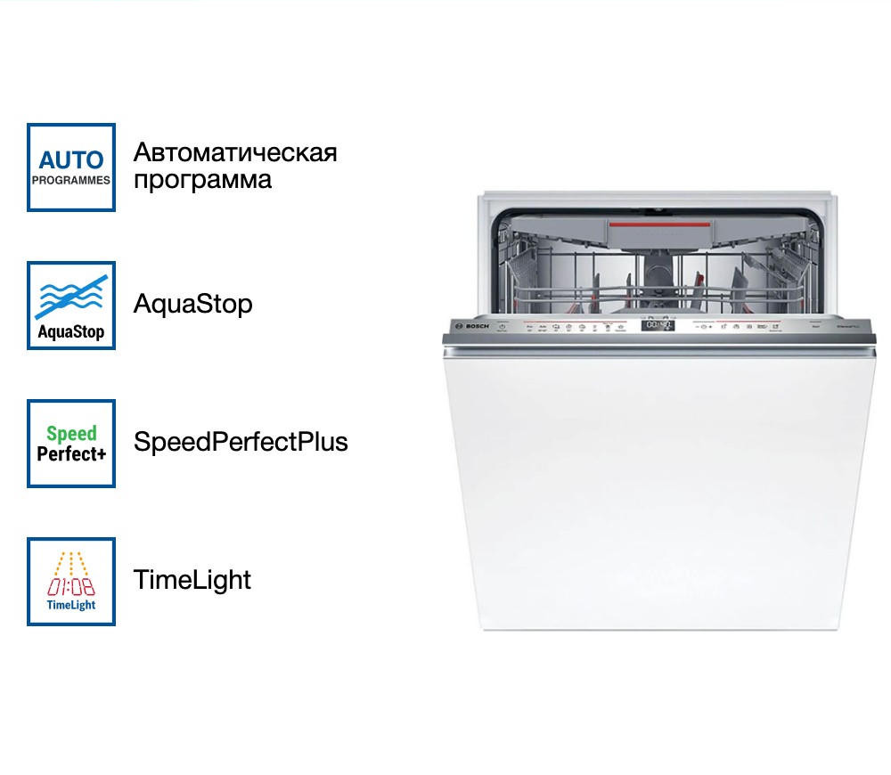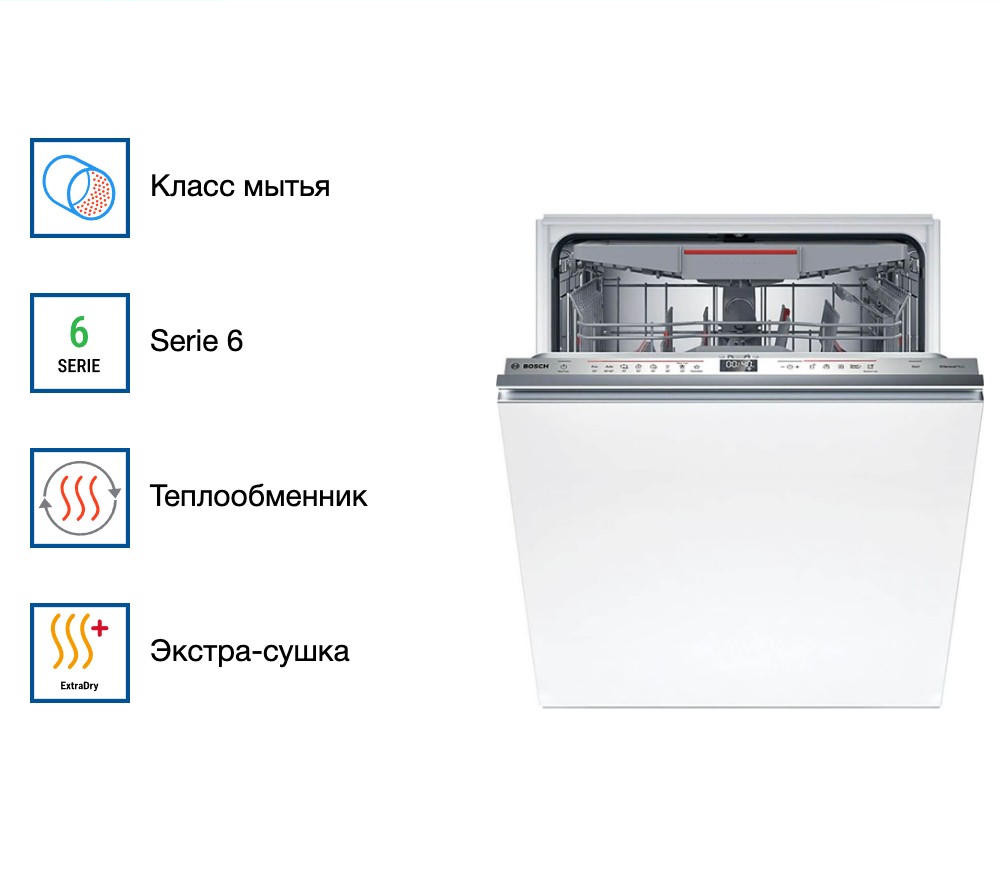 Экстра-сушка гарантирует идеально сухую посуду, а функция SpeedPerfectPlus сокращает время мойки без потери качества. Самоочистка фильтра и внутренняя подсветка облегчают уход за машиной.