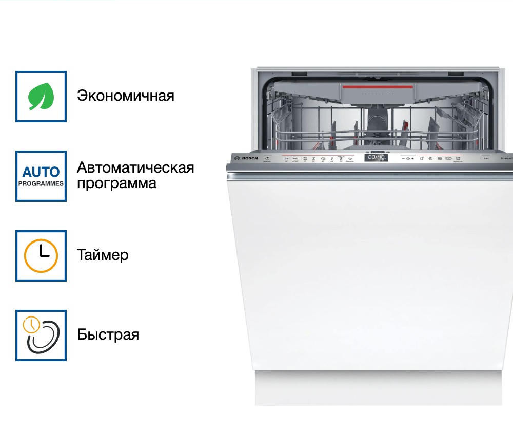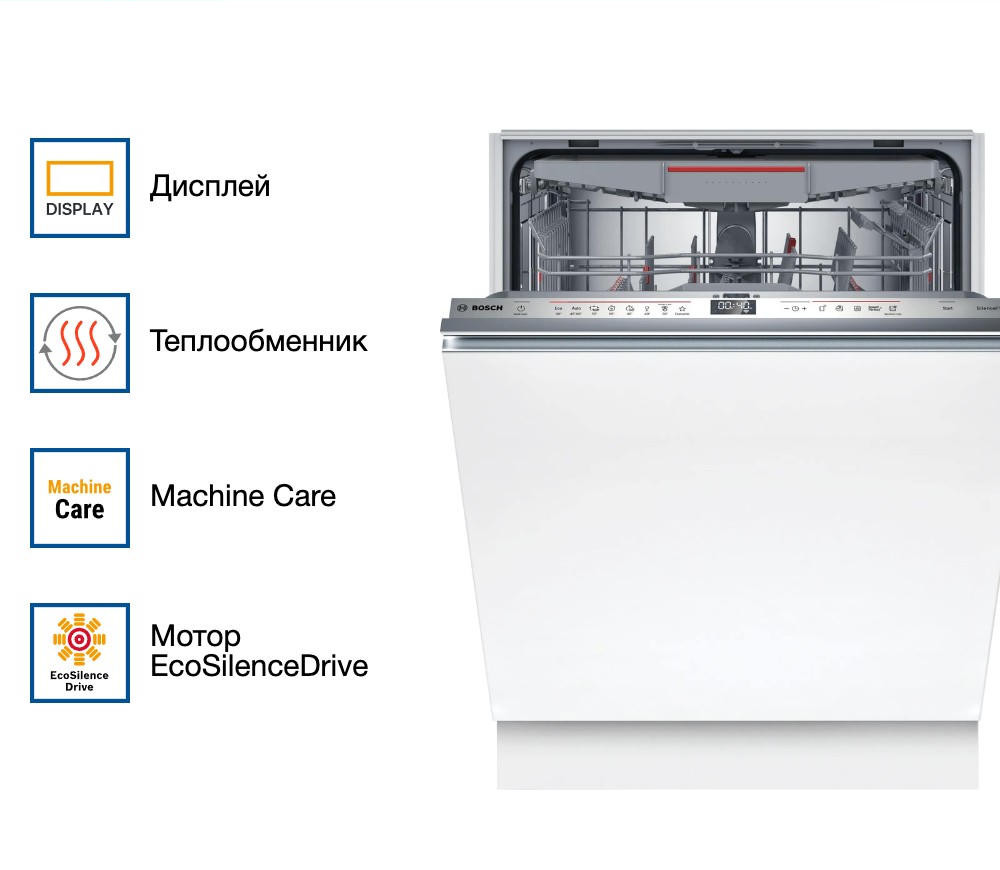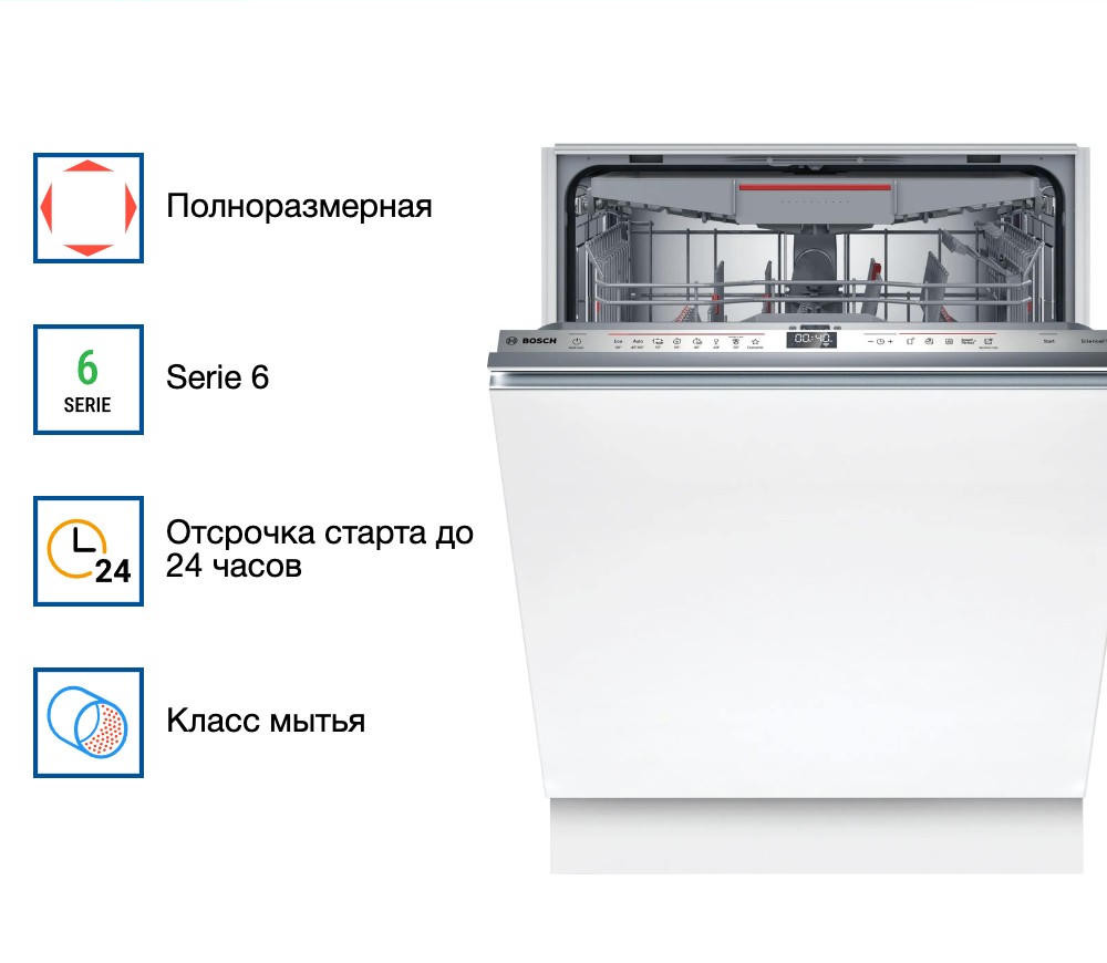 Встраиваемая посудомоечная машина Bosch SMV6ECX93E оснащена технологией Home connect с помощью нее вы можете управлять устройством отдаленно со смартфона. Имеется третий уровень загрузки VarioDrawer для столовых приборов. При работе модель практически не слышно ее шум составляет всего 42 дБ.