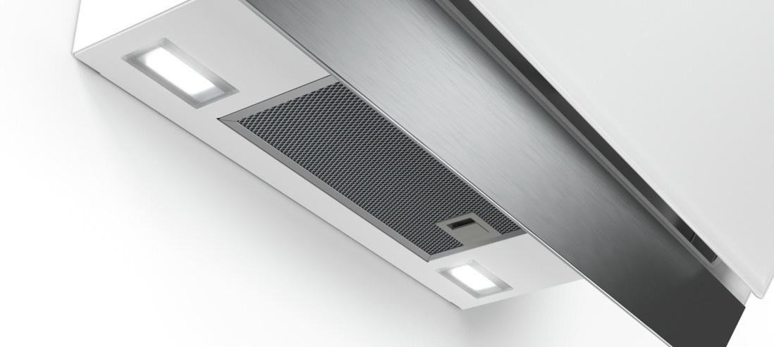 Сенсорное управление Touch Select расположено на передней панели, легким касанием вы можете переключить скорости и включить свет. Решетка жироулавливающего фильтра закрыта стеклянным экраном. Металлический фильтр можно мыть в посудомоечной машине.