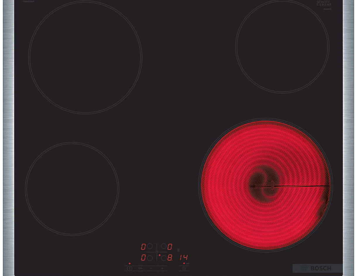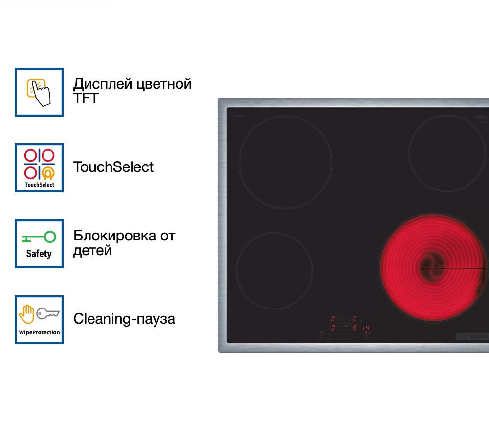 Варочная панель Bosch PKE645BB2 имеет функцию Restart, она сохраняет ваши настройки и при следующем включении восстанавливает их. Функция блокировка от детей предотвращает непреднамеренное нажатие на панель управления. С помощью индикации остаточного тепла вы всегда можете убедиться, что конфорки остыли или еще накалены.