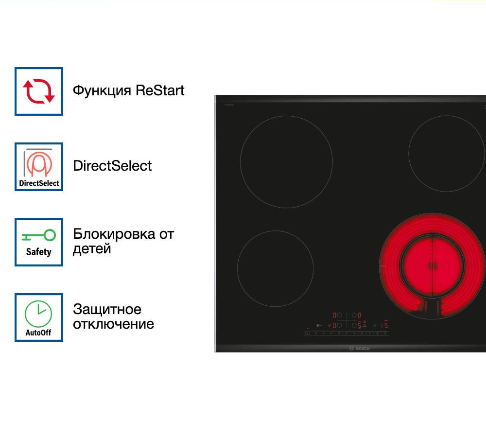 Функция ReStart позволяет быстро возобновить работу панели после внезапного отключения питания, сохраняя выбранные ранее настройки. Функция PowerBoost значительно увеличивает мощность конфорки, что позволяет сократить время приготовления блюд.