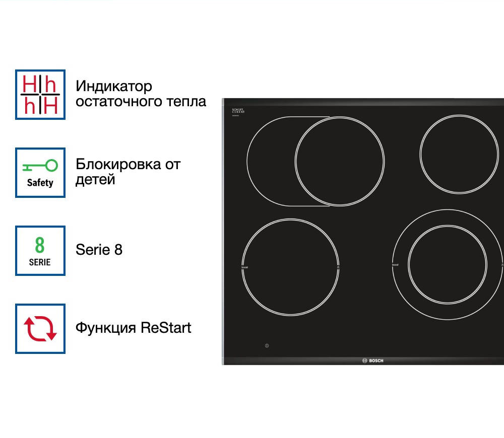 Помимо функциональности, устройство оборудовано надежными защитными механизмами. Панель автоматически отключается при длительном отсутствии активности, предусмотрена блокировка от детей, а индикатор остаточного тепла показывает, какие зоны еще горячие. Главный выключатель позволяет полностью обесточить устройство при необходимости.