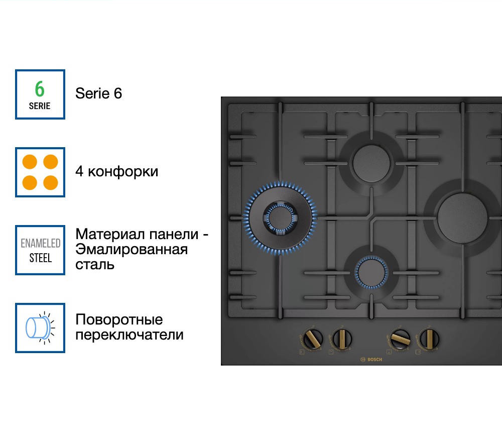 Варочная панель Bosch PCI6В3B90R представлена в классическом черном цвете. Ее поверхность выполнена из эмалированной стали и отличается простотой в уходе. Работать с этой моделью достаточно легко. Количество конфорок — 4. Зоны нагрева стандартные, также имеется конфорка с двумя кольцами пламени.