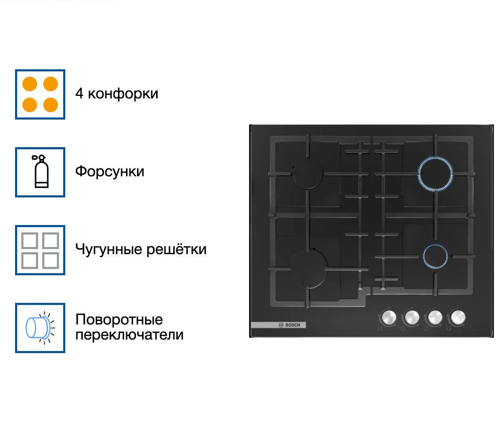 - Четыре мощные газовые конфорки