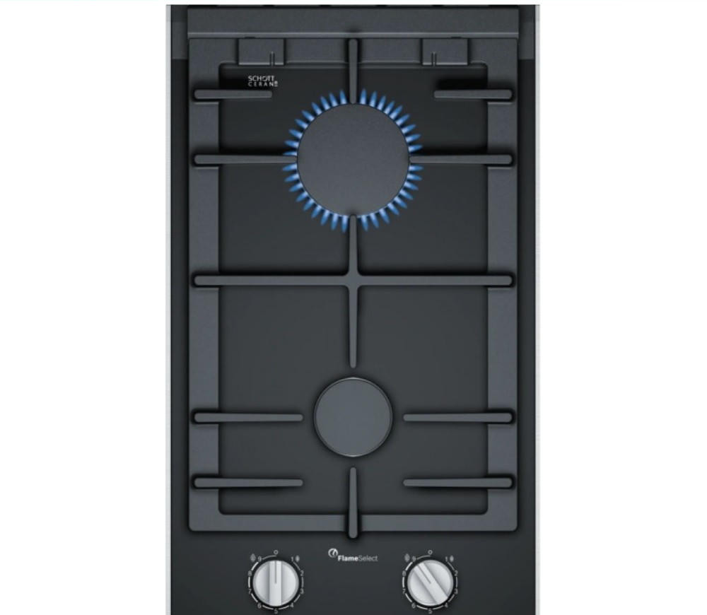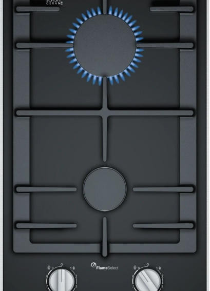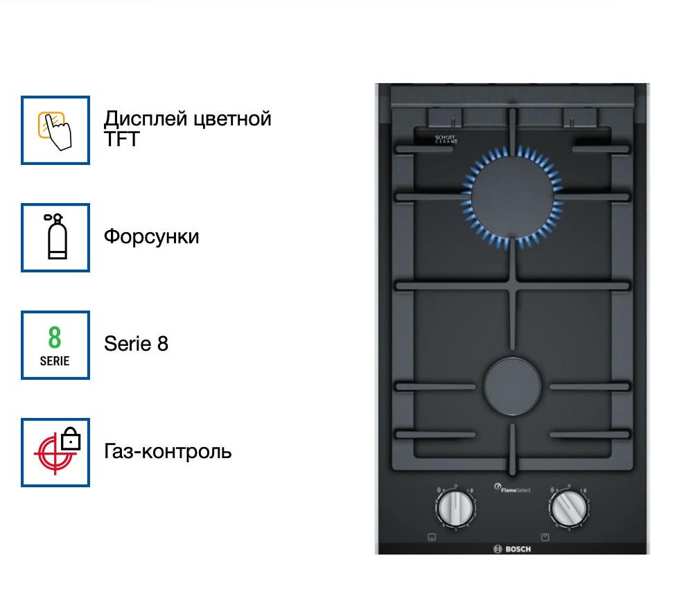 Варочная панель Bosch PRB3A6B70 представлена в черном цвете материал поверхности стеклокерамика. Имеется автоматический электроподжиг, он включается при повороте регулятора мощности. Есть защита при затухании пламя подача газа прекратится.