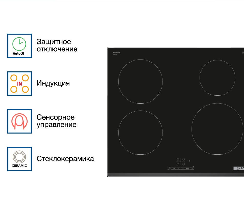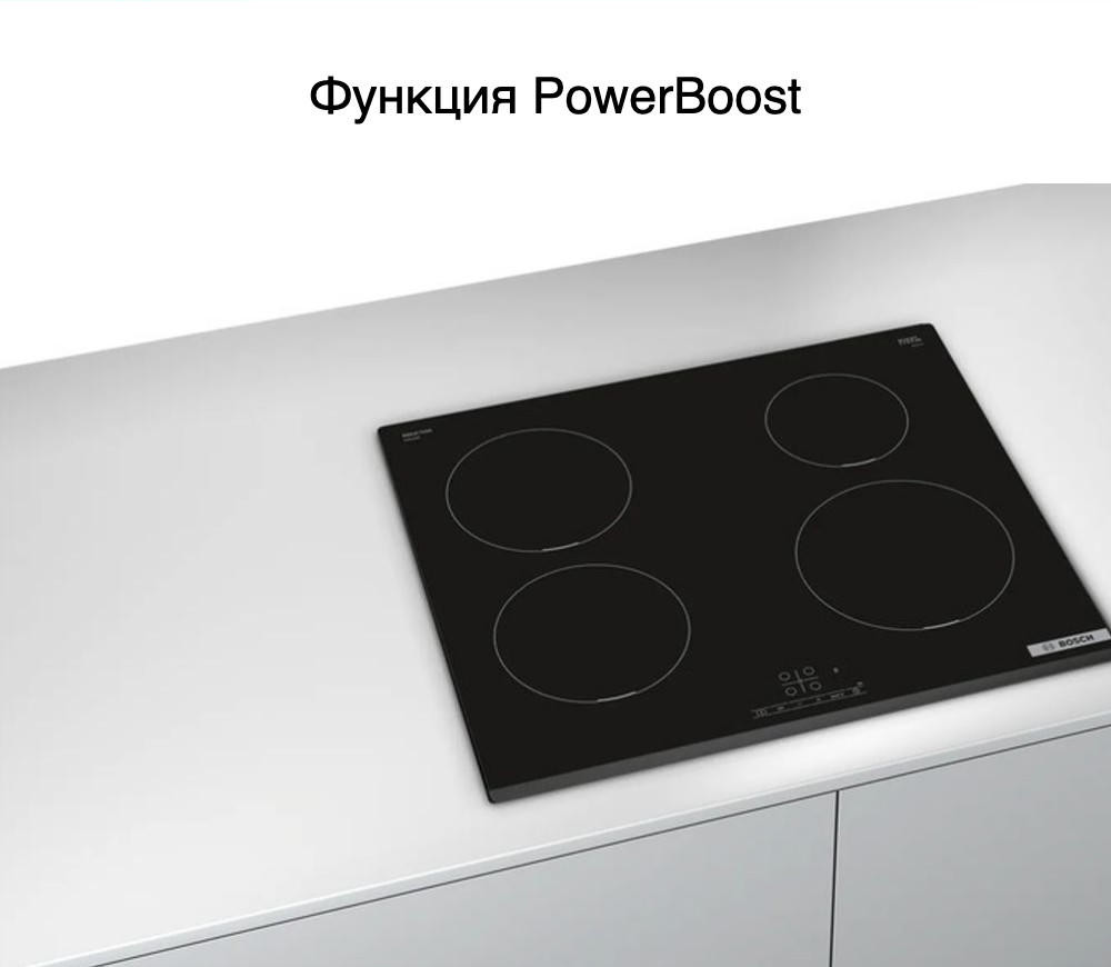 Варочная панель Bosch PIE 631BB5E оснащена таймером, который отключает выбранную конфорку по истечение времени. «Блокировка от детей» поможет от случайного нажатия. При внезапном отключении поможет функция памяти заданных настроек, при повторном включении все заданные параметры восстановятся.