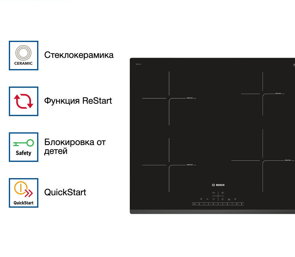 Привлекательный дизайн и эргономичность делают панель Бош PIE631FB1E отличным выбором для любого кухонного интерьера.