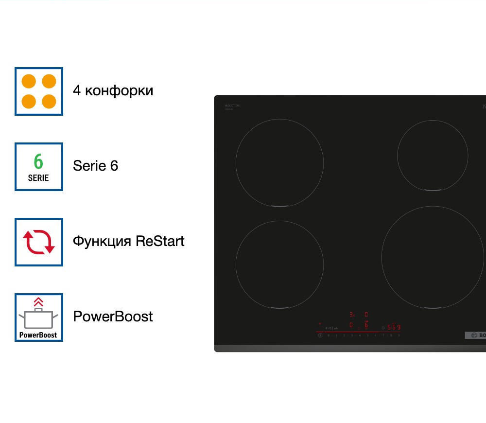 Индукционная варочная панель Bosch PIE631HB1E - современное решение для вашей кухни. Модель оснащена четырьмя конфорками, что позволяет одновременно готовить несколько блюд. Уникальная черная поверхность панели придает ей элегантный и стильный вид. Сенсорное управление и TFT-дисплей обеспечивают удобство и простоту использования. Функция распознавания посуды автоматически определяет размер и положение посуды на панели, что позволяет эффективно использовать энергию.